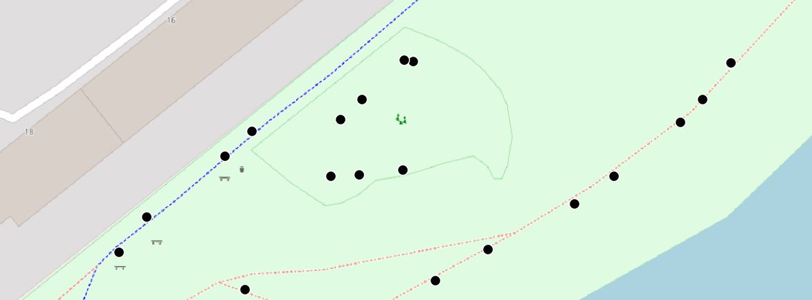 Dobrym sposobem sprawdzenia położenia ławek jest zestawienie ich z danymi umieszczonymi na mapie OpenStreetMap.org. Poniżej przedstawione jest porównanie ławek z OSM (symbol ławki) i zinwentaryzowanych ławek w I kwartale 2022 (symbol kropki).