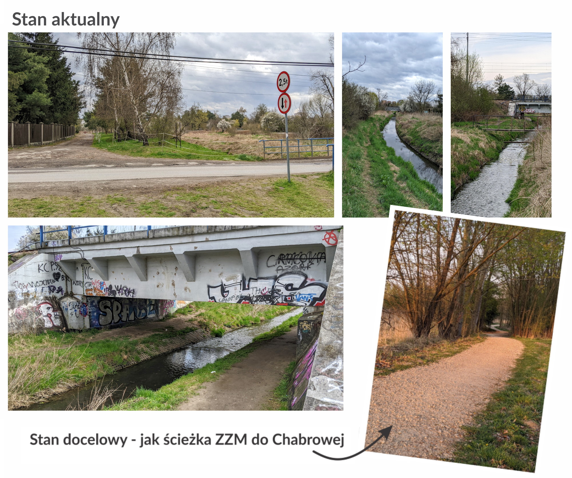 Przy wykonywaniu ścieżki między ulicami Chabrową i Jordanowską poinformowano nas, że trasa musi się kończyć 20 m przed ulicą Jordanowską z uwagi na planowaną kompleksową przebudowę skrzyżowania ulic Jordanowskiej, Stelmachów i Piaskowej (w tym m.in. rondo do utworzenia w miejscu obecnego mostku). Biorąc pod uwagę, że ruchliwość tego miejsca może jedynie wzrosnąć, proponujemy przedłużenie ścieżki pieszo-rowerowej (przy użyciu tej samej, sprawdzonej technologii) możliwie z dala od planowanego skrzyżowania, a więc: