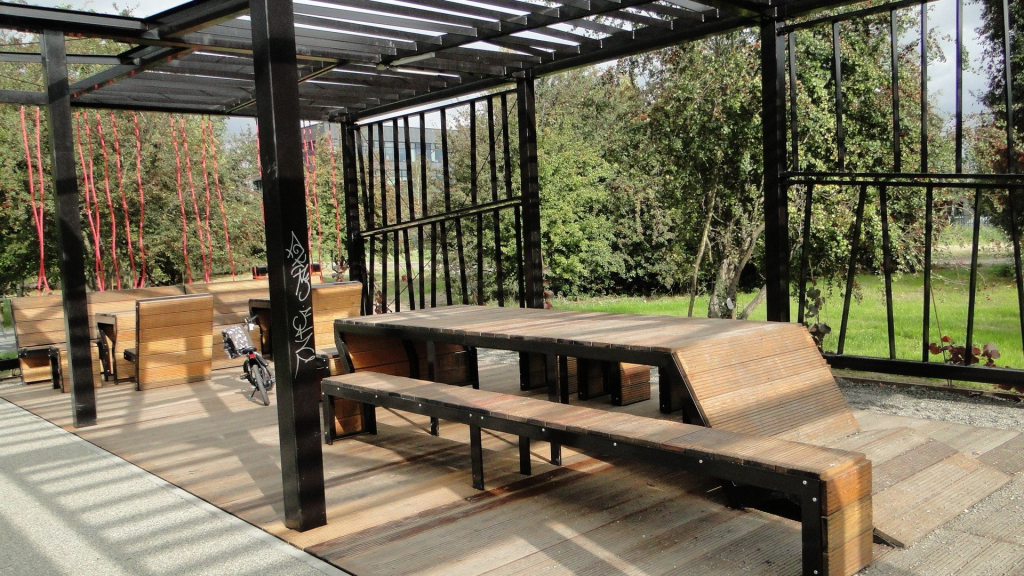 W ramach projektu w tym miejscu powstanie zadaszona pergola wraz z leżakami i hamakami, oraz stolikami na których mogłyby się odbywać zajęcia lub spotkania młodzieży po lekcjach. Ważne aby dookoła było dużo zieleni, aby miejsce było zadaszone i "przytulne" dla osób które będą z niego korzystać. Z miejsca będą również korzystać osoby niepełnosprawne - więc ważne aby nie było np. schodów. Poniżej kilka propozycji: