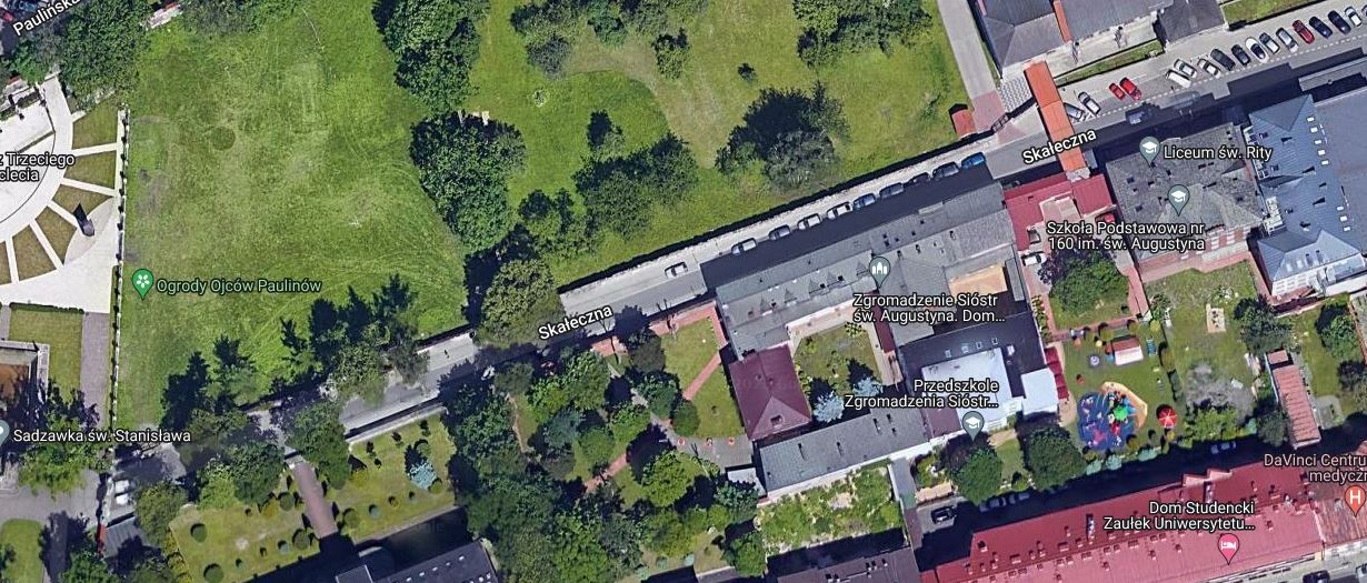 W 2022 Zarząd Zieleni Miejskiej wydzierżawił od O.O. Paulinów ogród, który ma zostać oddany do użytku mieszkańcom. Ogród przylega do ulicy, od której jest wprawdzie odgrodzony murem, ale na tej części Skałecznej tylko we fragmencie mogą parkować auta. Parking jest przewidziany jedynie na 8 aut. Ulica Skałeczna prowadzi na Skałkę, jeden z najważniejszych zabytków Krakowa oraz jeden z symboli polskości. Pierwszym etapem tworzenia zielonych przestrzeni jest usuwanie z chodników betonowych płyt i starych nawierzchni. Projekt zakłada zerwanie asfaltu i wąskich chodników i zaprojektowanie zielonej przestrzeni dla mieszkańców i turystów, którzy z tej perspektywy mogliby w ciszy i spokoju kontemplować i kościół na Skałce i kościół św. Katarzyny. Ponieważ w tym pasie drogowym jeszcze kilka lat temu były posadzone drzewa, niestety ostatnie nawałnice je poważnie uszkodziły i zostały usunięte, projekt zakłada dosadzenie kilku drzew, krzewów, bylin i ustawienie ławek i śmietników. Projekt zakłada zaprojektowanie ścieżek w celu zapewnienia dostępności miejsca również dla osób z niepełnosprawnością.