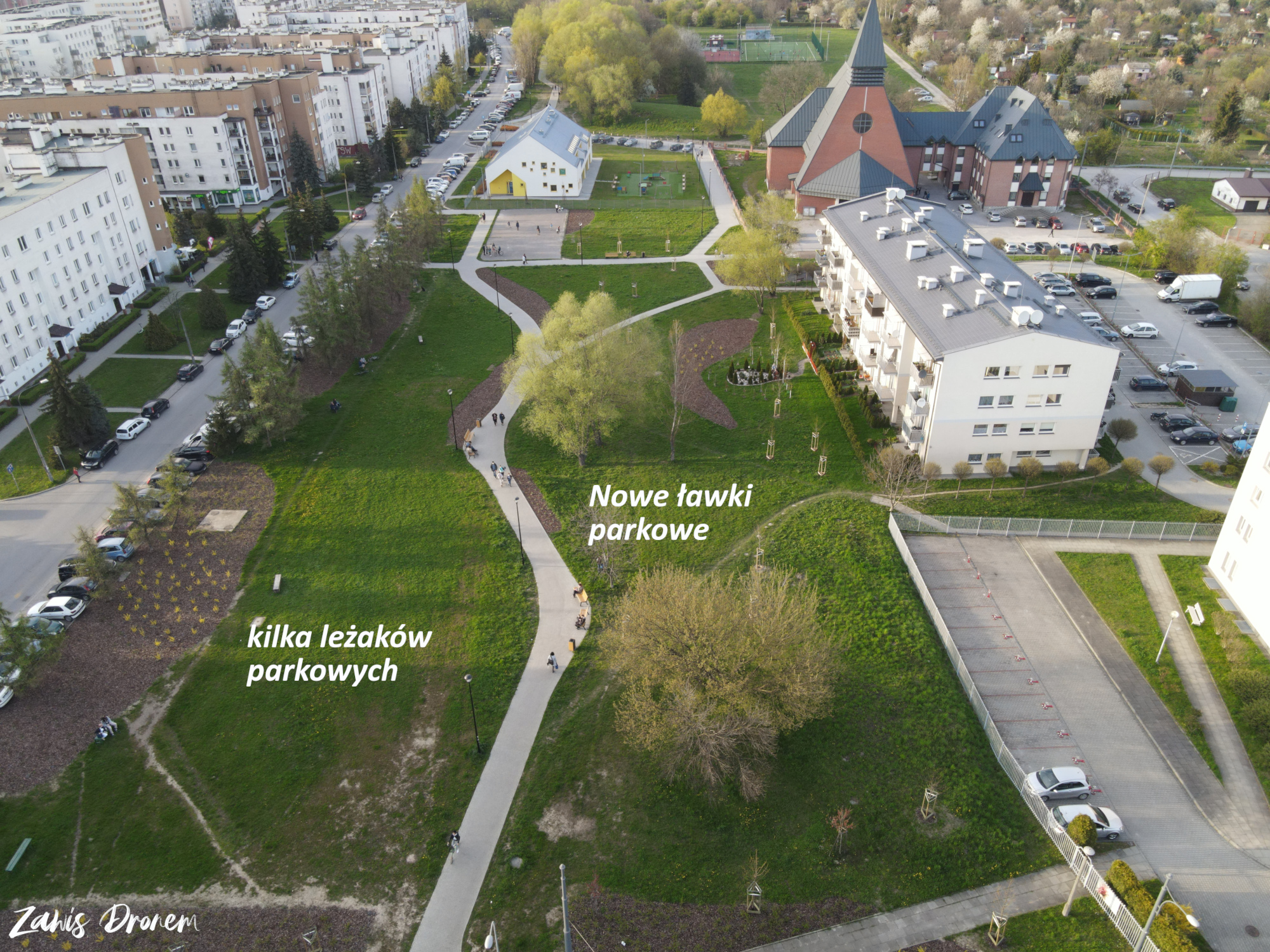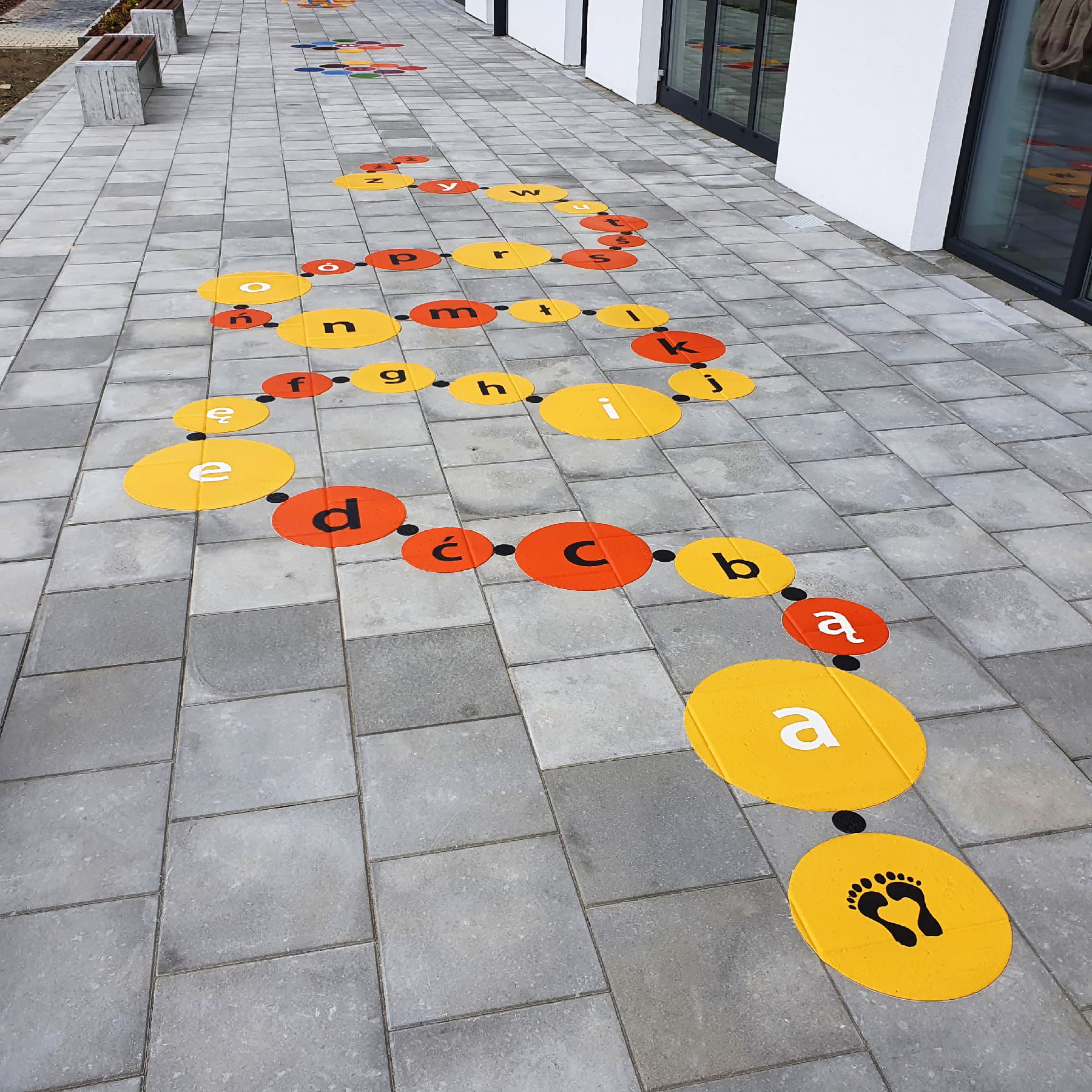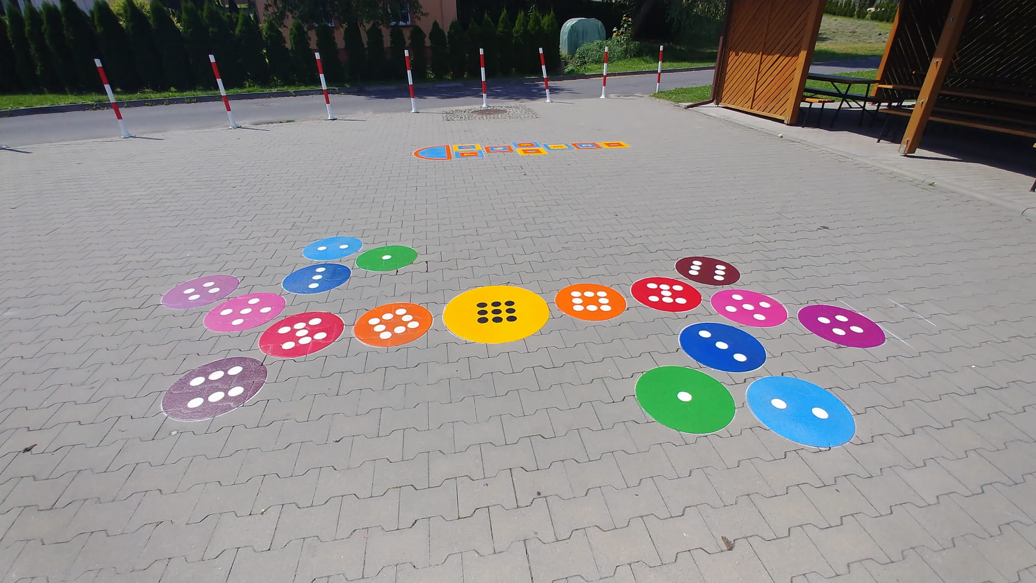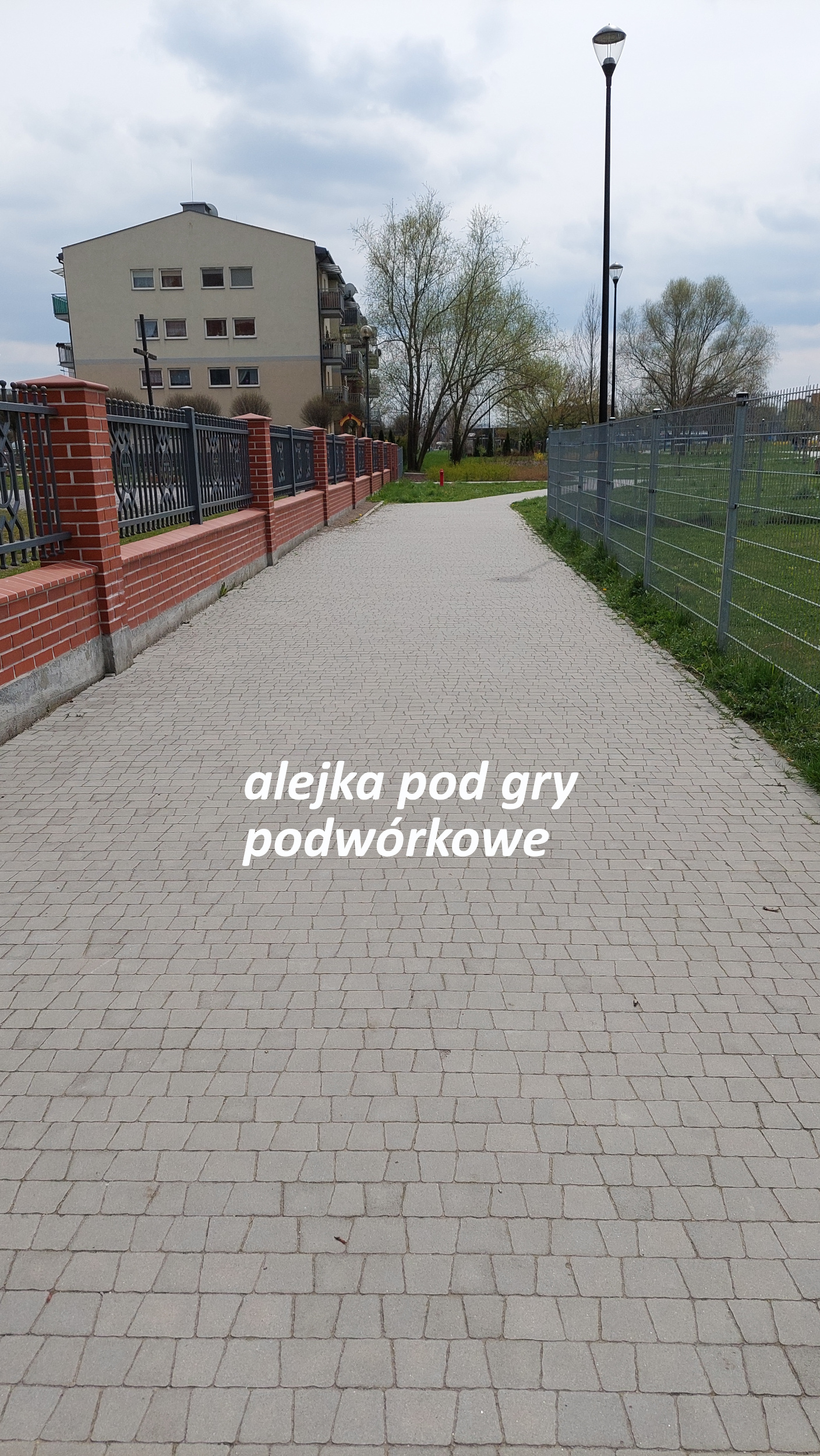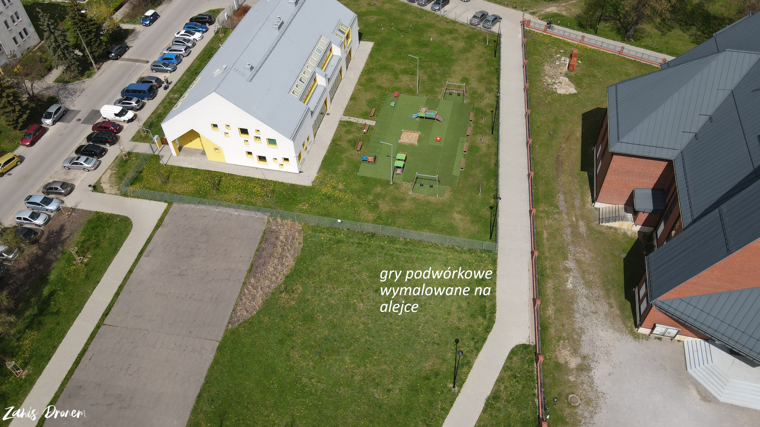 Natomiast na istniejącej alejce, pomiędzy żłobkiem a kościołem, planuje się wymalowanie kilku plansz do gier podwórkowych (typu: klasy, twister, czy guziki), wykonanych z masy termoplastycznej oraz wykonanie tablic z zasadami wybranych gier.