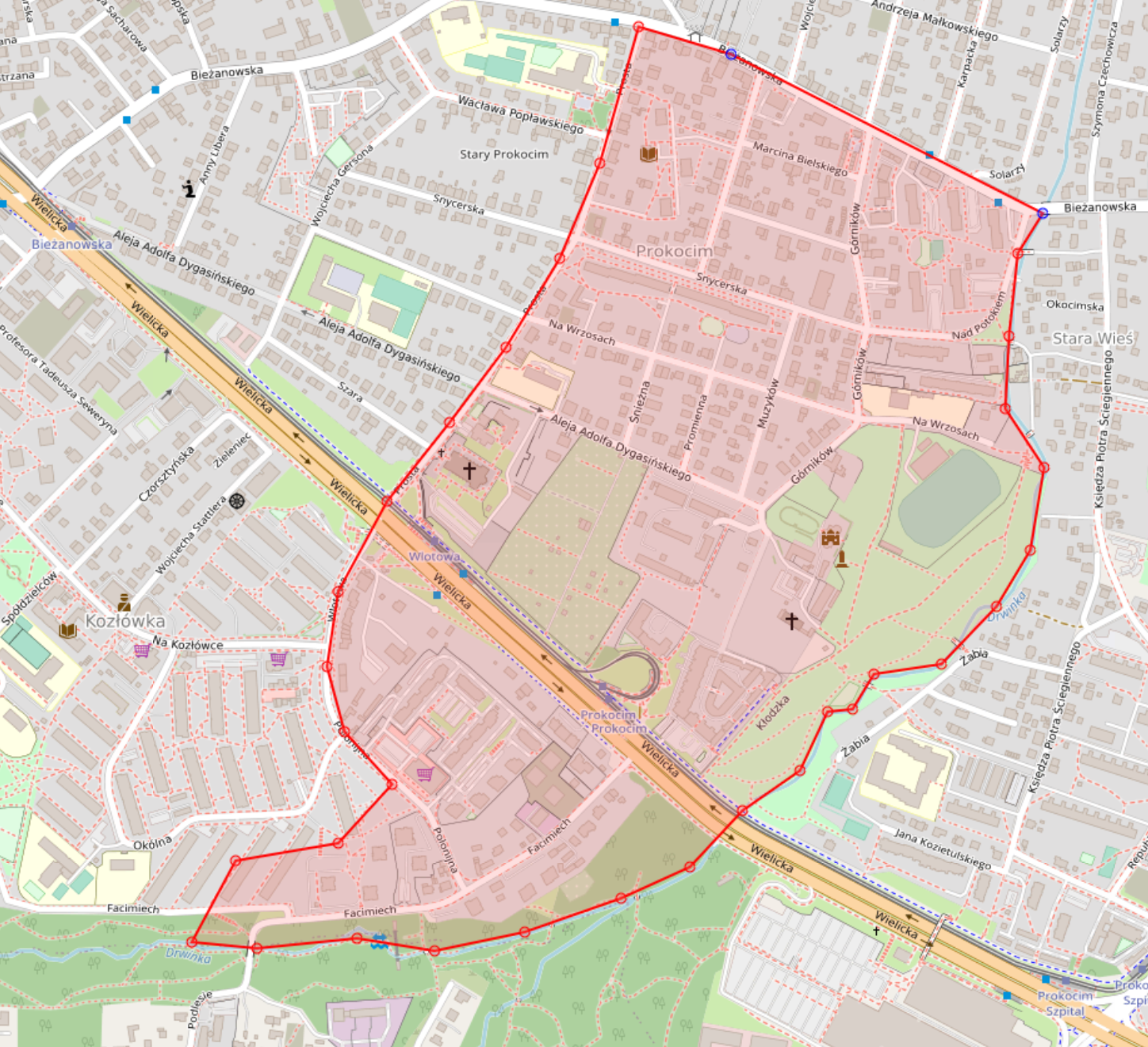 Główna lokalizacja: Główna lokalizacja: Główna lokalizacja: Obszar ponad 65 ha Starego Prokocimia (pomiędzy rzeką Drwinką, ul. Bieżanowską, ul. Prostą i ul. Wielicką) oraz część os. Na Kozłówce (ograniczony ul. Polonijną, ul. Facimiech i rzeką Drwinką)