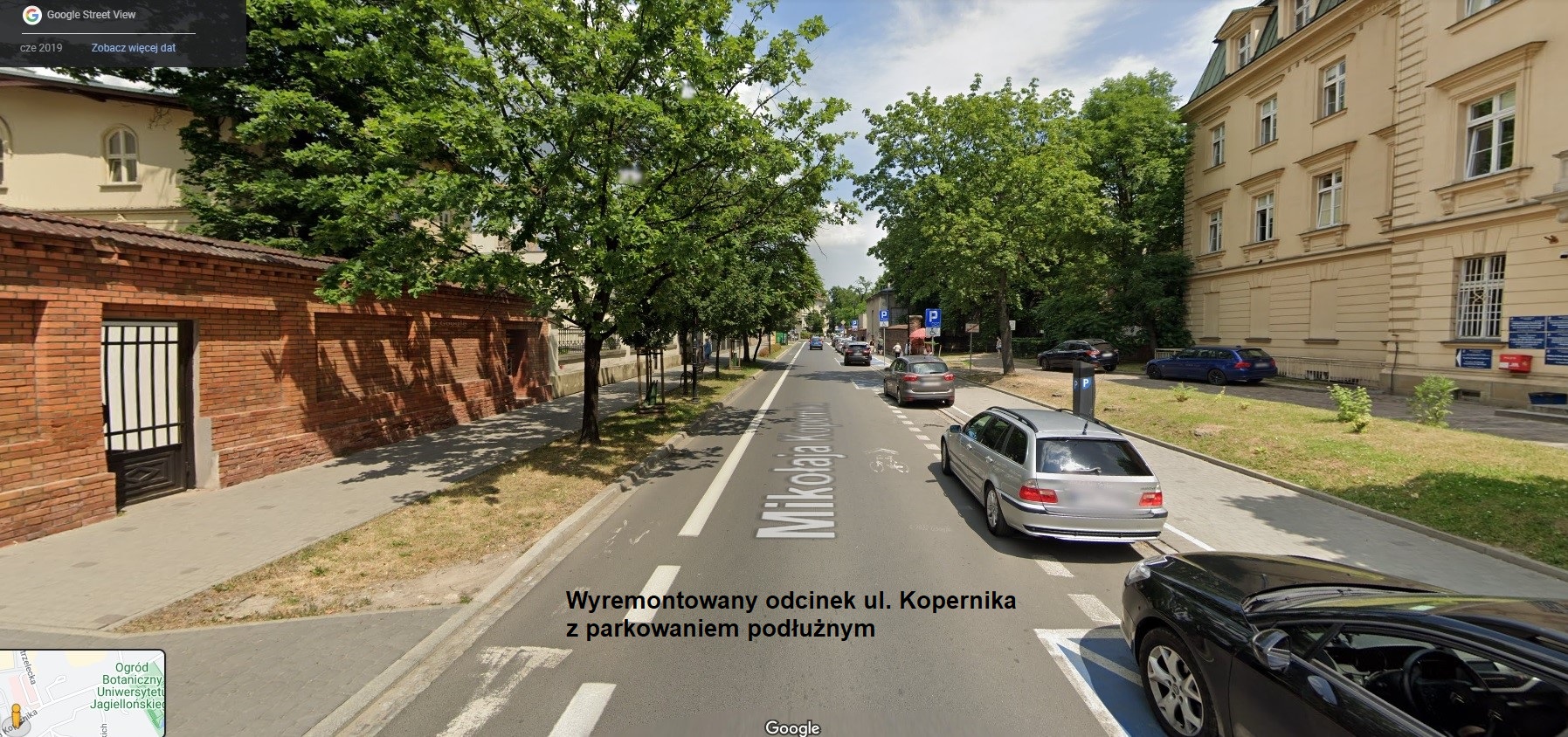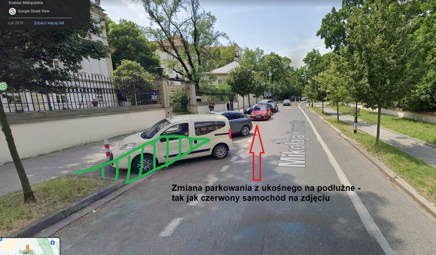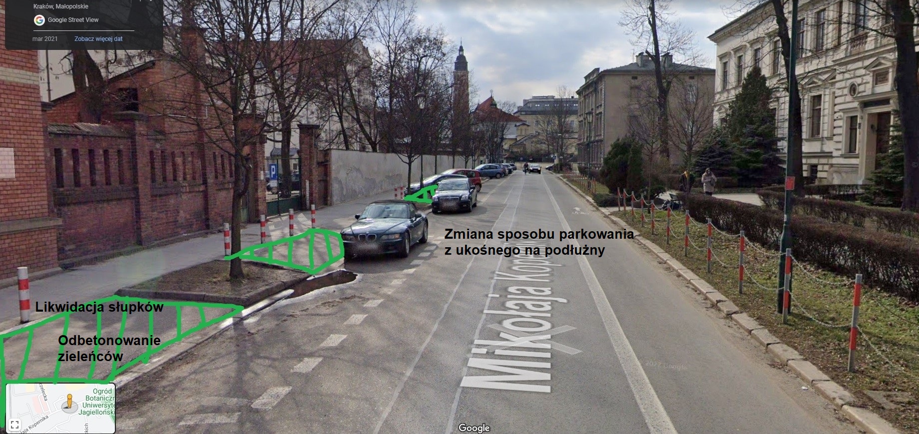 Od skrzyżowania z ul. Strzelecką ulica Kopernika po stronie południowej, tj. tej z miejscami parkingowymi pozostaje z na wpół zabetonowanymi zieleńcami . Na dawnych trawnikach parkują ukośnie samochody, które przed tarasowaniem chodnika zabezpieczają niepasujące do zabytkowego charakteru ulicy biało-czerwone słupki. Odkąd większość oddziałów szpitalnych wyniosła się z ul. Kopernika, zapotrzebowanie na miejsca parkingowe zmniejszyło się. Parkowanie podłużne pozwoli odbetonowanać zieleniec, który będzie oddzielał ciąg pieszy od jezdni, na której będą zaparkowane samochody.