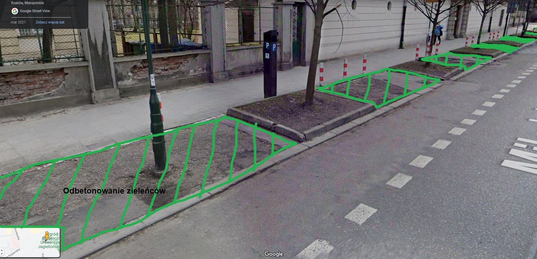 skutków: Projekt zakłada likwidację betonowych nawierzchni pomiędzy istniejącymi okienkami, powiększenie i utworzenie nowych zieleńców oraz zmianę parkowania na równoległe. Realizacja całości projektu przyczyni się to do poprawy komfortu pieszych i bezpieczeństwo rowerzystów, poprawi infrastrukturę miejską i estetykę otoczenia.
