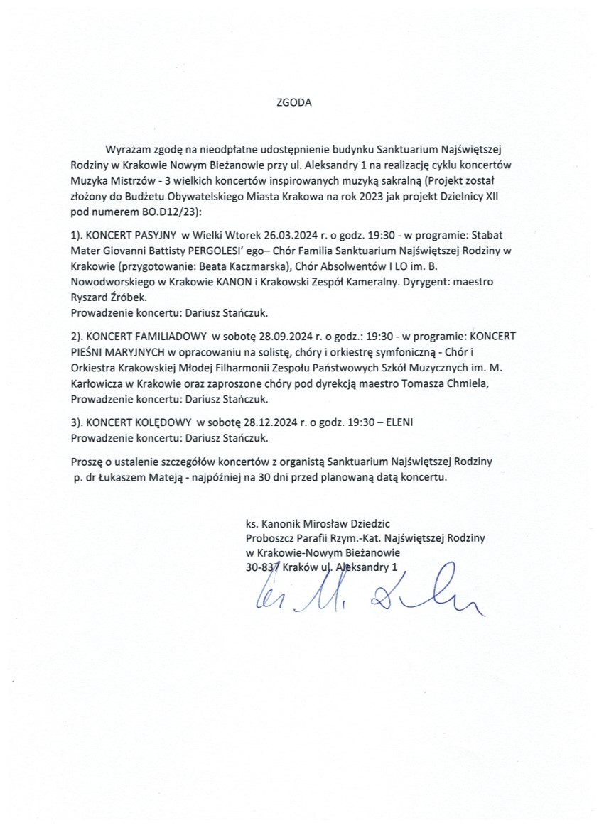 2). KONCERT FAMILIADOWY w sobotę 28.09.2024 r. o godz.: 19:30 - w programie: KONCERT PIEŚNI MARYJNYCH w opracowaniu na solistę, chóry i orkiestrę symfoniczną - Chór i Orkiestra Krakowskiej Młodej Filharmonii Zespołu Państwowych Szkół Muzycznych im. M. Karłowicza w Krakowie oraz zaproszone chóry pod dyrekcją maestro Tomasza Chmiela,
