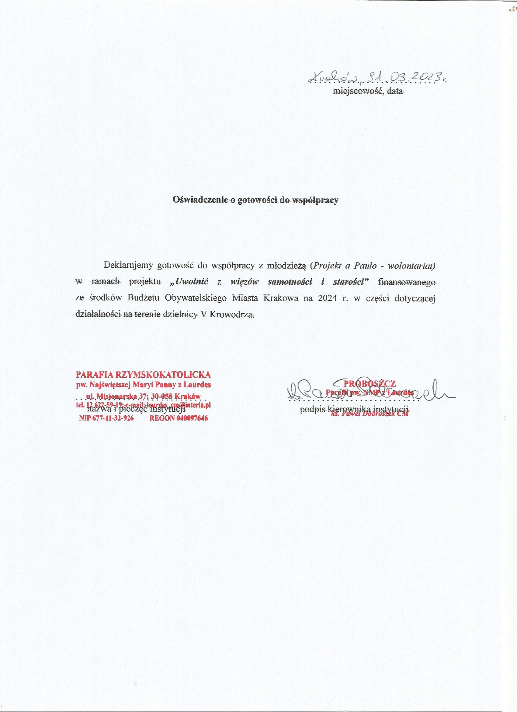 Od października 2017 roku działamy w dzielnicy V Krowodrza jako "Projekt a Paulo", czyli młodzi ludzie służący pomocą ludziom starszym i ubogim. Jednym z podejmowanych przez nas działań jest pomoc w Klubie Seniora, który znajduje się w sąsiedztwie kościoła na Misjonarskiej 37. Od wielu lat wolontariusze „Projektu a Paulo” odwiedzają osoby potrzebujące w ich domach i pomagają im w zakresie codziennych, podstawowych czynności. Seniorzy bardzo często nie widzą potrzeby wydawania pieniędzy na zdrowie czy utrzymanie czystości lub zwyczajnie mają ich za mało. Natomiast my wierzymy, że poprawa warunków mieszkaniowych przełoży się również na ich komfort życia, przywróci chęć do działania, radość z dnia codziennego, stworzy w nich świadomość estetyki oraz potrzeby dbania o swoje mieszkania. Chcemy zapewnić seniorom potrzebne środki czystości oraz sprzęt do sprzątania, przeprowadzić naprawy, montaże i małe remonty. W czystym, posprzątanym i uporządkowanym otoczeniu przyjemniej spędza się czas. Często panuje przekonanie, że nie warto podejmować wysiłku dla osób starszych, ponieważ są oni u kresu życia. Naszym zdaniem jest całkowicie na odwrót! Niezależnie od tego ile czasu im zostało, chcemy zapewnić im czystą i przytulną przestrzeń, w której będą naprawdę dobrze się czuć. Mieszkanie dla wielu osób samotnych to jedyne miejsce spotkań z drugim człowiekiem. Kiedy jest ono w złym stanie, ludzie mogą wycofywać się z życia społecznego tłumacząc to wstydem. Jesteśmy przekonani, że poprawiając warunki mieszkaniowe przyczynimy się do ponownego otwarcia się tych osób. Mamy świadomość, że praca ze starszymi ludźmi będzie wymagać od nas jako ludzi młodych pokonywania własnych barier oraz wychodzenia ze swojej strefy komfortu. Poprzez przebywanie z osobami starszymi i samotnymi możemy wiele się od nich nauczyć, a zarazem mamy satysfakcję, że możemy pomóc drugiemu człowiekowi. Realizacja naszego projektu wpłynie również na promocję Krakowa jako miasta otwartego i dostosowanego do ludzi starszych i samotnych. Powodem smutku, a nawet depresji u osób starszych jest bardzo często zamknięcie się w swoim własnym świecie. Chcemy zmieniać ich myślenie, aby udowadniać, że życie naprawdę może być piękne. Bardzo często osoby starsze są samotne, ponieważ czują się zapomniane przez rodzinę. Będziemy starali się szukać sposobów na poprawę kontaktu naszych podopiecznych z ich bliskimi. Chcemy ubogacić seniorów naszą młodością, a naszą energią obudzić ich do życia. Mocno wierzymy, że dialog międzypokoleniowy jest możliwy. Pragniemy przełamywać stereotypy związane z postrzeganiem starości oraz walczyć z wykluczeniem społecznym ze względu na wiek. Naszym zadaniem jest uczenie tolerancji i odwagi życiowej, a także inspirowanie do rozwijania swoich pasji niezależnie od wieku. Chcemy sprawić, by seniorzy cieszyli się każdym dniem, każdą chwilą, każdą osobą. Udowadniać im, że warto żyć.