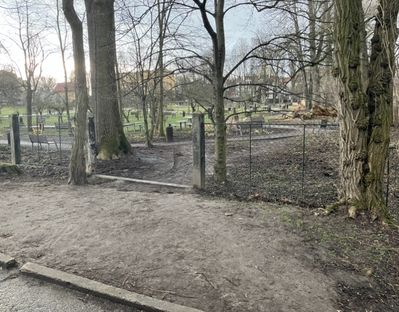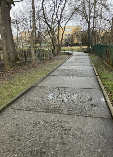 Wejście do ogrodu od strony wschodniej nie zostało chyba zaplanowane w pierwszym projekcie parku, jednak z upływem czasu jest ono równie często używane jak główne od ul. Naczelnej. Jednak stan chodnika od tej strony wymaga gruntownego remontu. Wielu pieszych idących od wschodniej części osiedla wybiera to wejście, jednak stan nawierzchni utrudnia im dojście. Szczególnie dotyczy to osób starszych i dzieci, również tych na rowerkach czy hulajnogach. Występujące w płytach dziury zagrażają bezpieczeństwu przechodzących tam pieszych, zarówno idących do parku jak i przemieszczających się na odcinku Dobrego Pasterza - Sudolska, z przystanku do centrum osiedla.