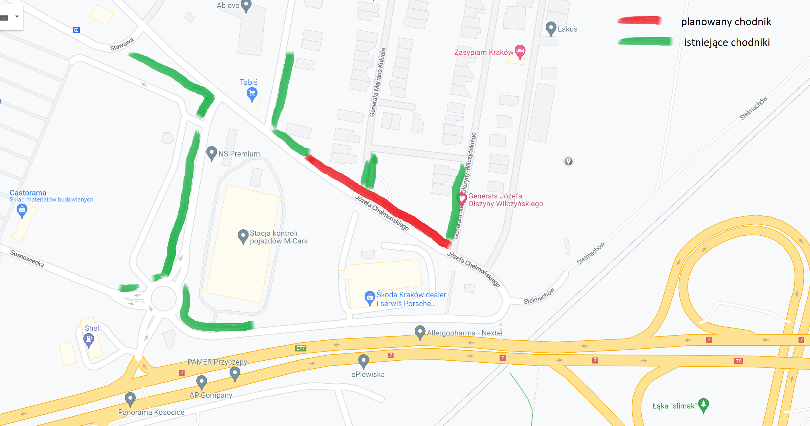 Niezależnie od powyższego, na wskazanym odcinku ul. Chełmońskiego zawarte są umowy inwestorskie na realizacje inwestycji drogowych w ramach inwestycji niedrogowych. Jedna z nich obejmuje budowę chodnika na wysokości posesji nr 100 do istniejącego chodnika (dł. ok. 30m).