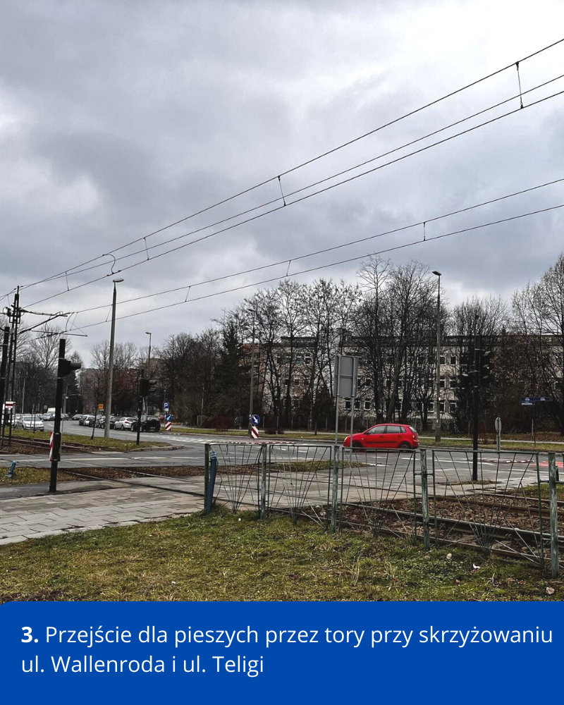 - Przejście dla pieszych przez tory przy skrzyżowaniu ul. Wallenroda i ul. Teligi