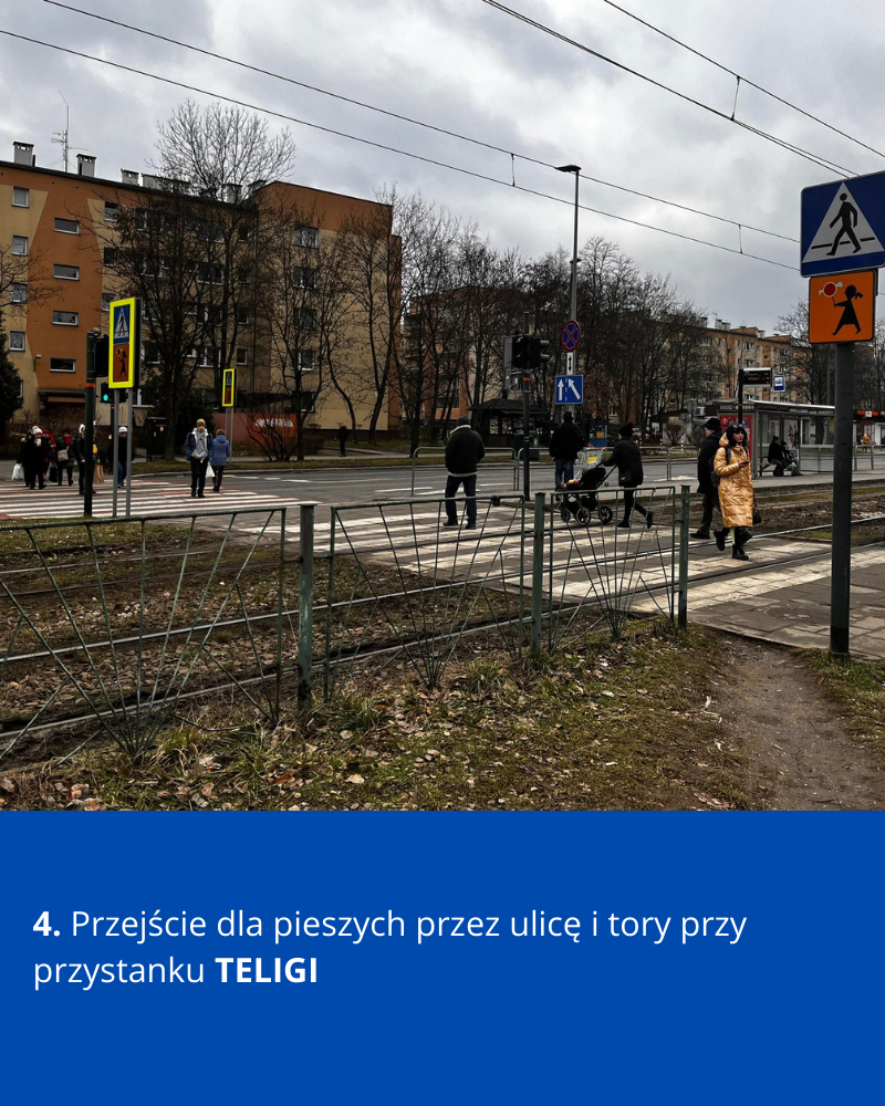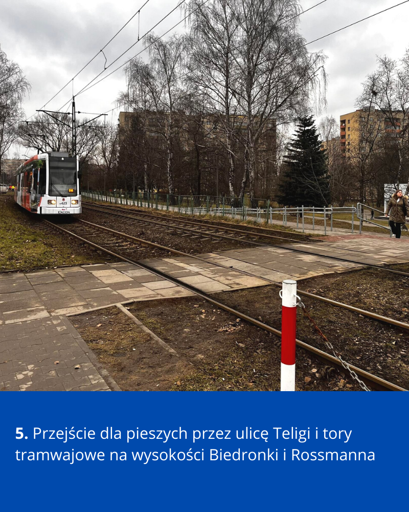 - Przejście dla pieszych przez ulicę Teligi i tory tramwajowe (na wysokości Biedronki/Rossmanna)