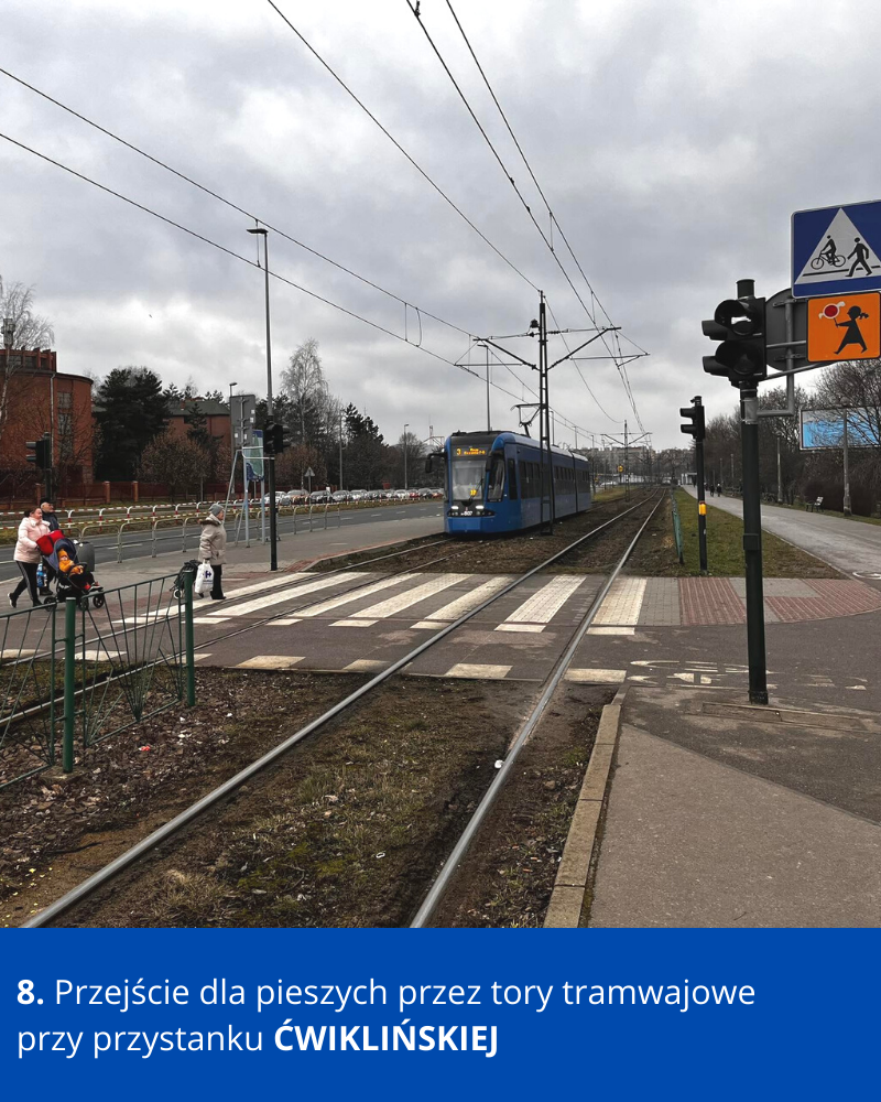 - Przejście dla pieszych przez tory tramwajowe przy przystanku Ćwiklińskiej