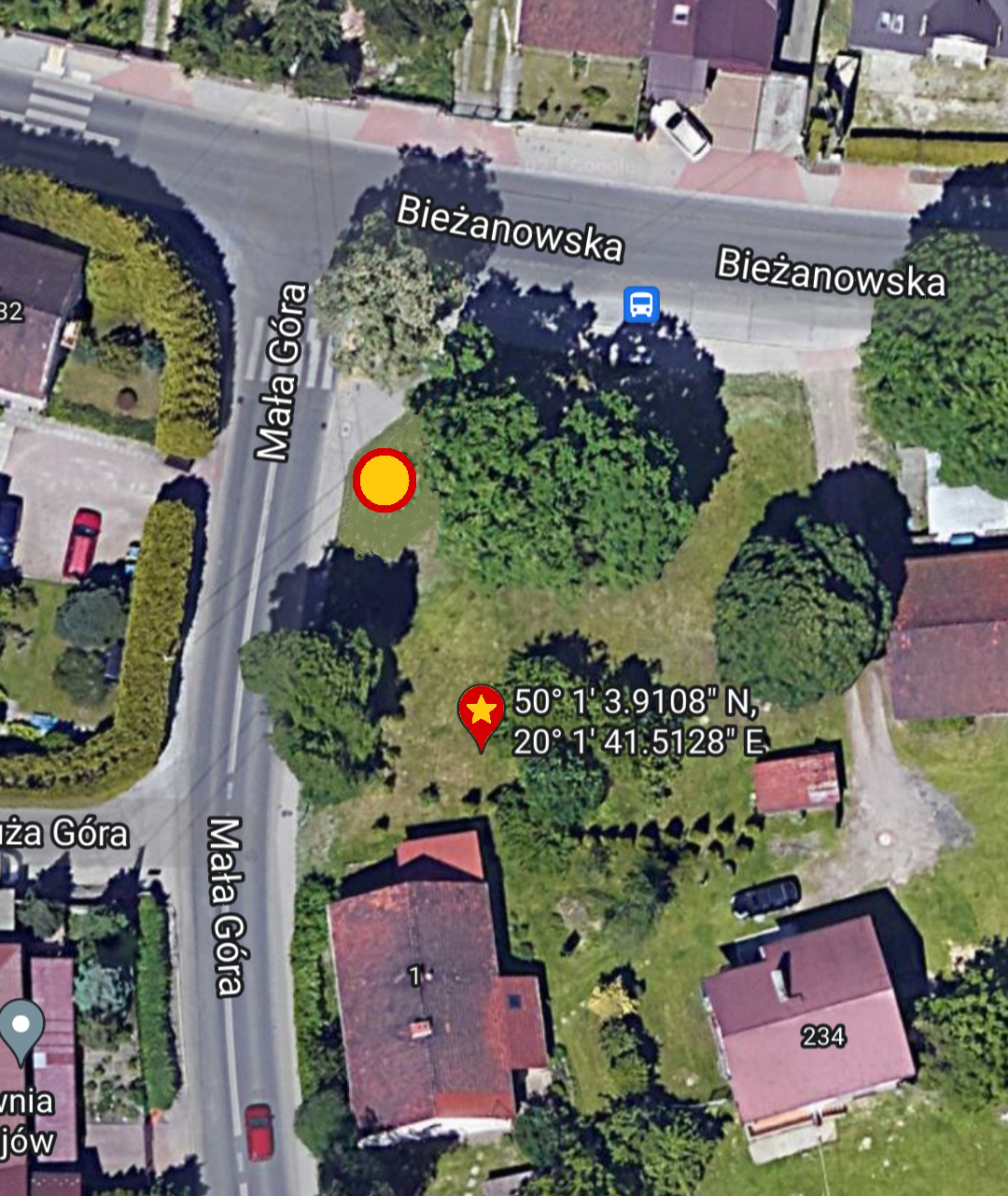 Główna lokalizacja: Zieleniec u zbiegu ulic Bieżanowskiej i Mała Góra, na działce ewidencyjnej 375/3, obręb 56, jednostka ewidencyjna Podgórze.