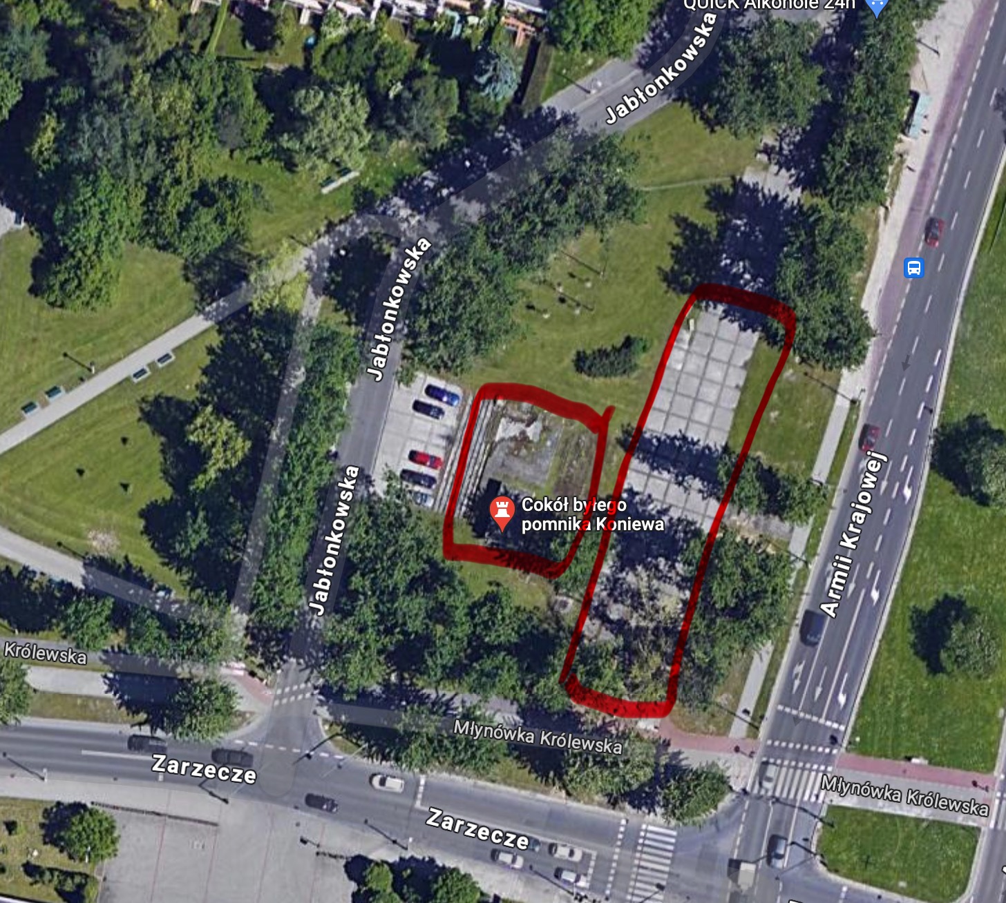 W pierwszym etapie projektu wykonana zostanie rozbiórka betonowego cokołu po pomniku Koniewa zlokalizowanego na działce 171/9 obręb K-6 Krowodrza. Następnie przeprowadzona zostanie likwidacja betonowych płyt zlokalizowanych po wschodniej stronie cokołu wzdłuż ulicy Armii Krajowej oraz schodów po