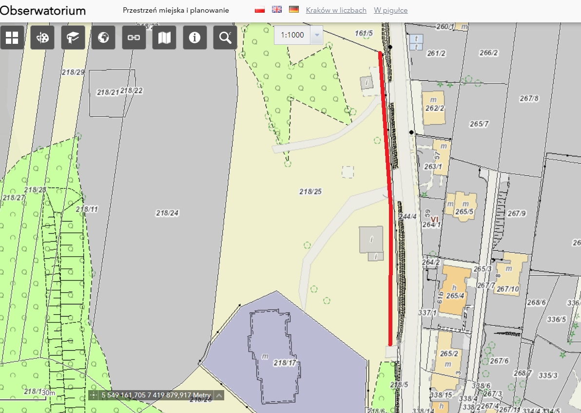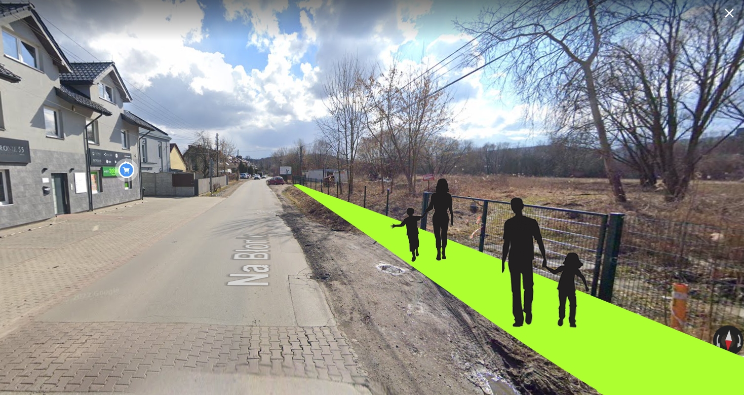 | Ścieżka z nawierzchni, po której można poruszać się z wózkiem dziecięcym + przesunięcie istniejącego ogrodzenia KS Bronowianka | Budowa chodnika/ścieżki o szerokości ok. 2 m na odcinku ok.150 m poza pasem drogowym (na gminnej działce 218/25 zarządzanej przez KS Bronowianka/Zarząd Infrastruktury Sportowej). Przesunięcie istniejącego ogrodzenia o ok. 2 m w stronę zachodnią (co pozwoli uzyskać wystarczającą przestrzeń pomiędzy ogrodzeniem, a jezdnią). Ścieżka od północnej krawędzi działki (od istniejącego budynku lub od istniejącej ścieżki) do jej południowej krawędzi (do istniejącej drogi dojazdowej do nowo budowanego osiedla). Ostateczna nawierzchnia, długość i szerokość ścieżki – do ustalenia z uwzględnieniem istniejącej roślinności (ZIS) | 300 000,00 PLN |