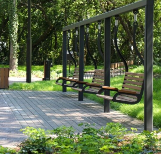 Projekt zakłada montaż trampolin, równoważni, huśtawek oraz hamaków, a także zamianę betonowych płyt na trawę i niskie krzewy zgodnie z miejscowym planem zagospodarowania terenu.