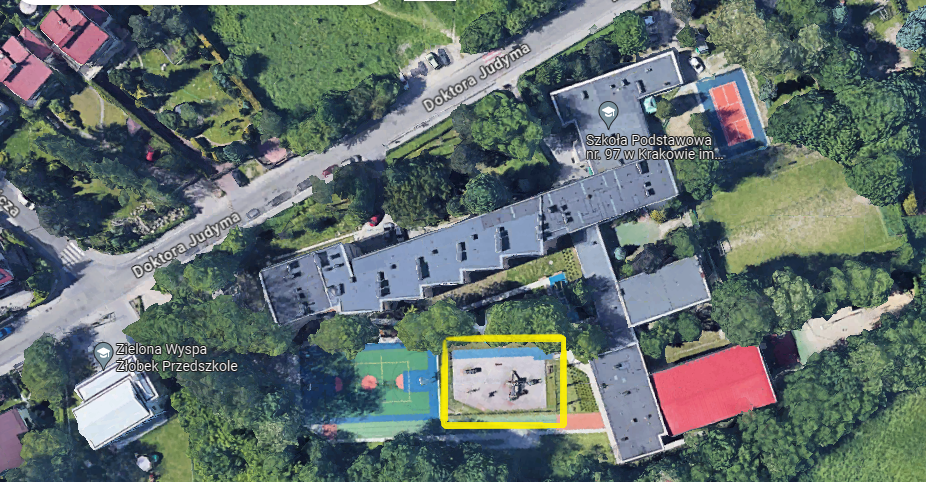 Modernizacja placu zabaw na terenie Szkoły Podstawowej Nr 97 w Krakowie polega na wymianie nawierzchni która uległa zniszczeniu ze względu na złe wykonania na etapie powstawania placu zabaw. Wymiary placu zabaw to 21x14 m. Był on wykonywany z projektu wesoła szkoła. Po tym jak nawierzchnia pod wpływem warunków atmosferycznych uległa zniszczeniu, inspektor BHP wyłączył plac zabaw z użytku.