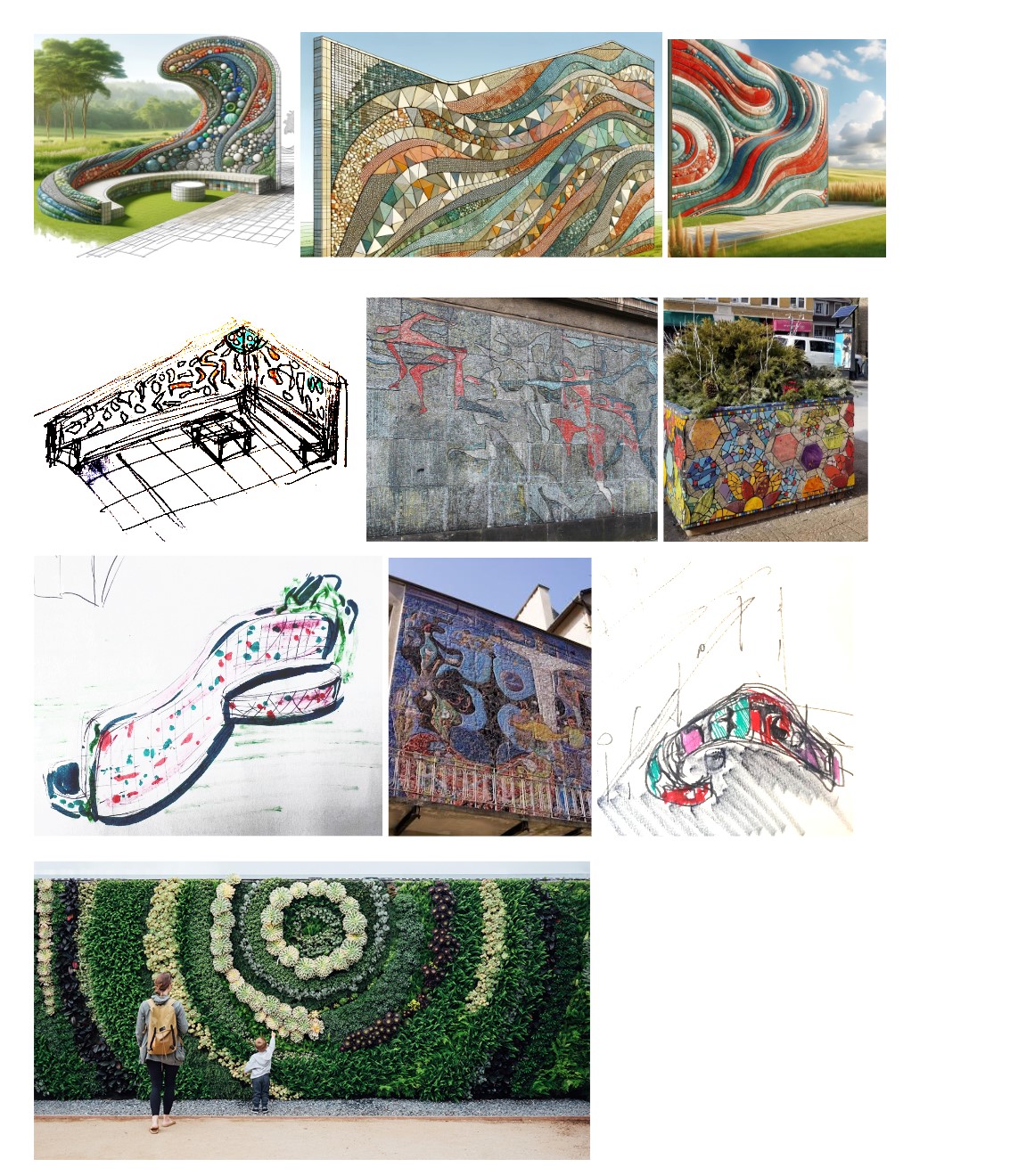 Ścianka o wymiarach minimum 5m długości zostanie zbudowana z pustaków i obłożona ręcznie wykonanymi płytkami ceramicznymi, nawiązującymi do charakterystycznego stylu Husarskich poprzez kolory i modułowy charakter. Będzie ona przedstawiać motywy związane z ich twórczością, a także motywy lokalne. Część ścianki zostanie obsadzona pnączami, łącząc w ten sposób sztukę z zielenią miejską. Przy ściance powinny znaleźć się również wykonane w podobnej technice miejsca siedzące pozwalające kontemplować kafle lub płytki ceramiczne, które będą składały się w formę mozaiki. Najbliższe otoczenie ścianki zostanie obsadzone pnączami, łącząc w ten sposób sztukę z zielenią miejską. Ławka będzie również miejscem czasowych wystaw rzeźbiarskich i/lub ceramicznych.