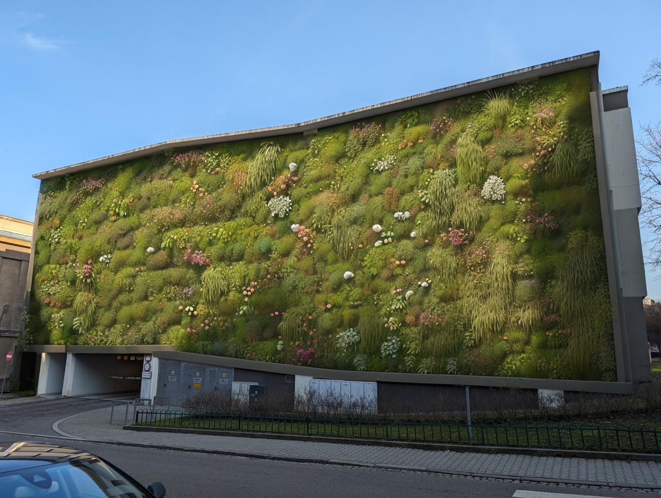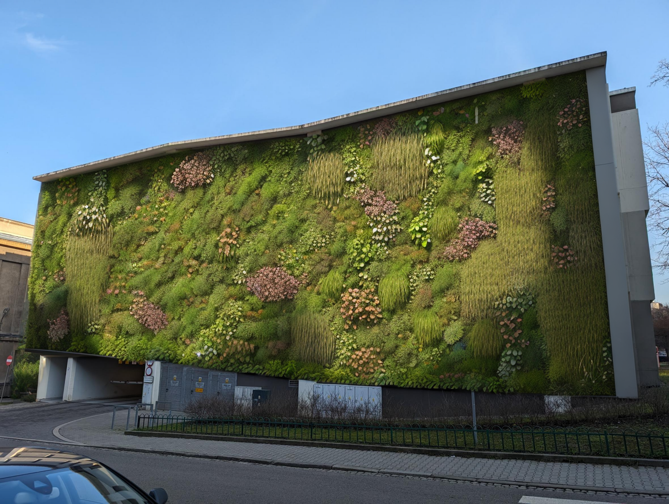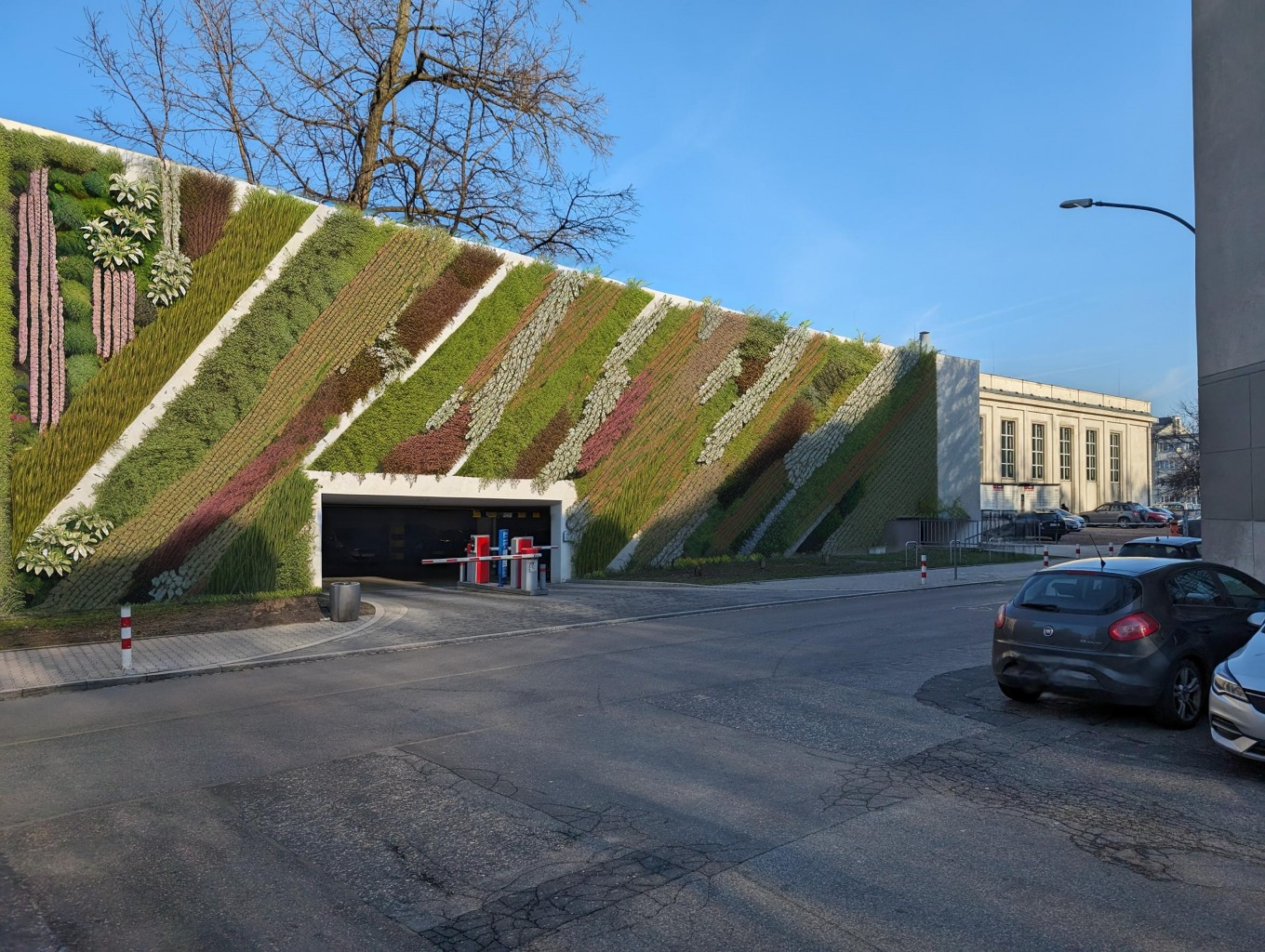 Zakładane jest wybranie rozwiązania bardziej kompleksowego niż sama winorośl, dzięki czemu na fasadzie budynku parkingu zostaną zamontowane specjalne konstrukcje umożliwiające uprawę roślinności wertykalnej. Poprzez zastosowanie różnorodnych gatunków roślin, stworzymy zielone ściany o różnorodnej strukturze i kolorystyce.