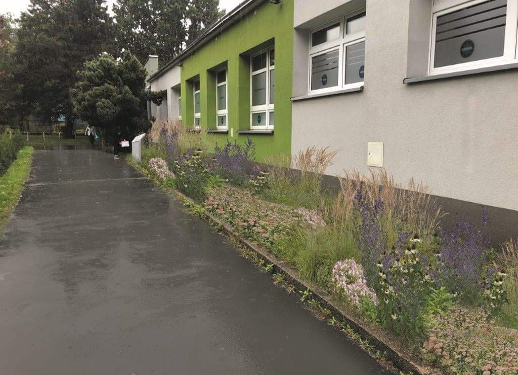 Proponowane nasadzenia będą gromadzić wodę opadową, zarówno tę, która trafia do niego bezpośrednio, jak i tę, która spływa z powierzchni nieprzepuszczalnych, np. z dachów, chodników czy podjazdów. Dzięki specjalnej konstrukcji podłoża i odpowiednio dobranym gatunkom roślin pomaga w naturalny sposób ograniczyć spływ wód opadowych do kanalizacji i sprawia, że roślinność uwalnia parę wodną do atmosfery stopniowo, także w okresach suchych. Taki ogród jest bardzo ekologiczny, może też bardzo pięknie wyglądać, a pełni bardzo ważną rolę edukacyjną. Nie wymaga tez specjalnej pielęgnacji, czy nawożenia.