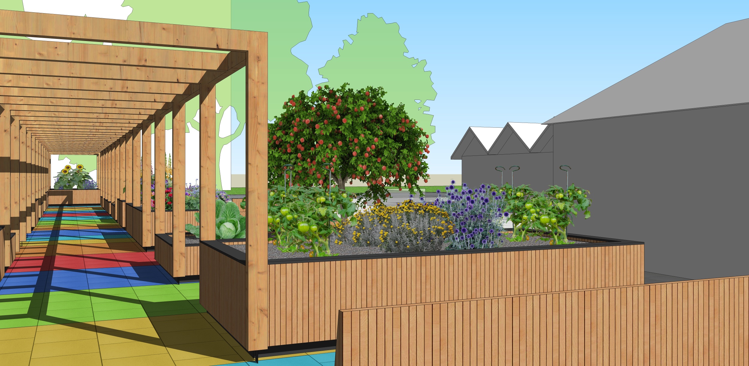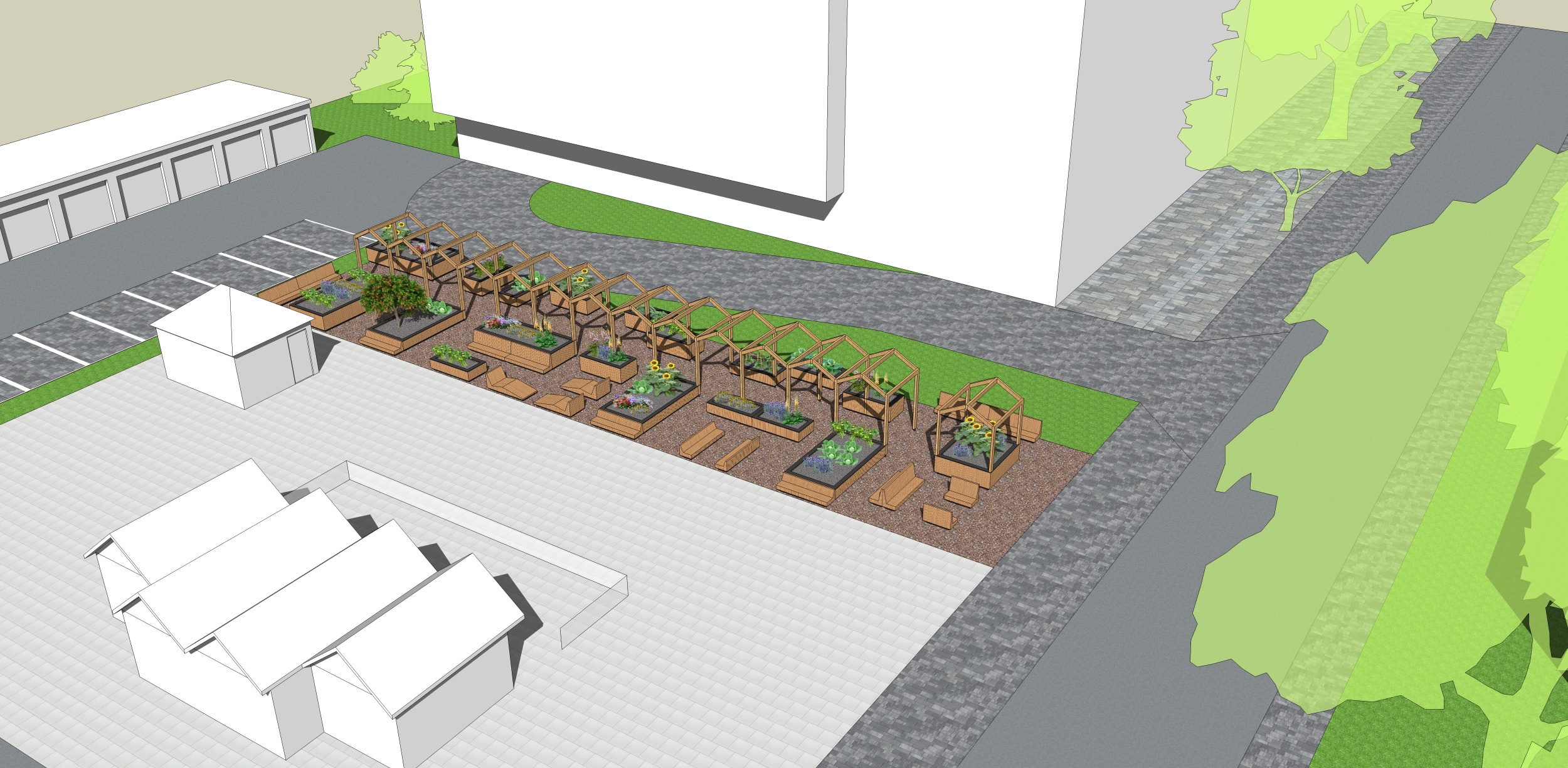 Ograniczenie nawierzchni utwardzonej przyczyni się do likwidacji wyspy ciepła i pomoże w zagospodarowaniu wody opadowej. Zostanie to osiągnięte przez usunięcie płyt chodnikowych na części placu, przygotowanie podłoża i wysypanie zrębków drewnianych.