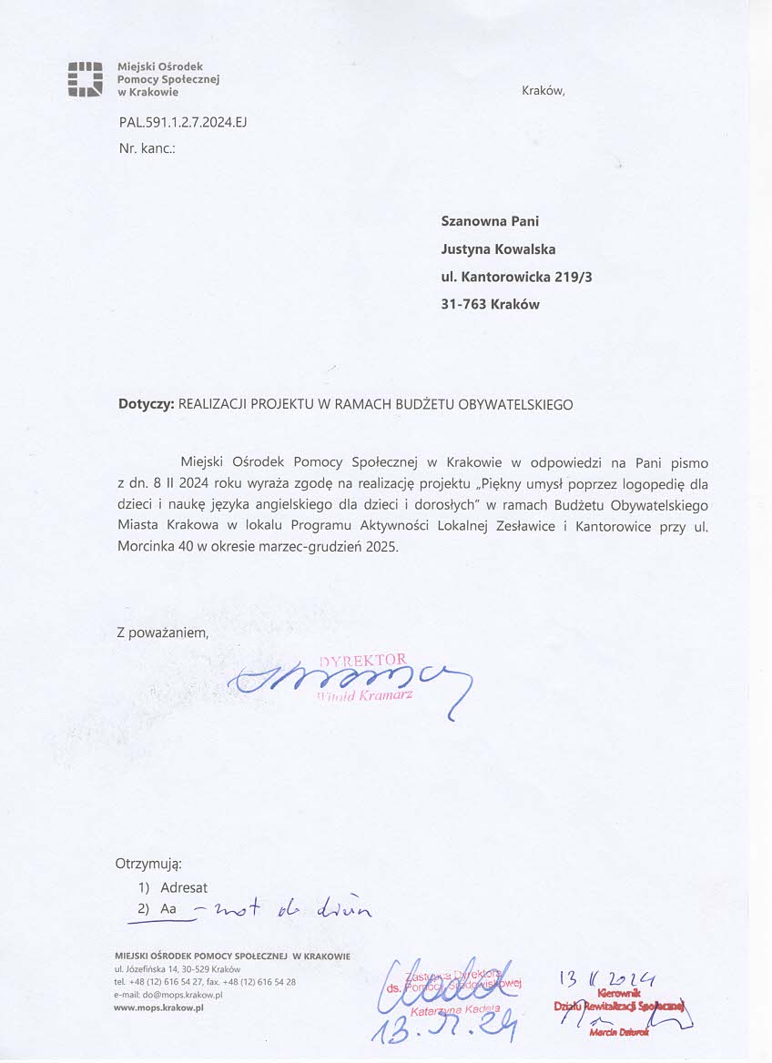 | j. angielski | lekcja z j. angielskiego 1x w tyg. dla dwóch grup,z przerwą na wakacje 2 miesiące | marzec - grudzień 2025 |