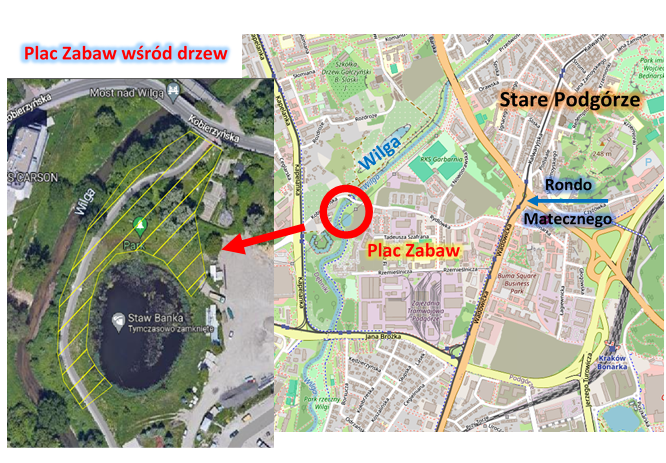 Główna lokalizacja: Obszar nad stawem Banka w Parku Rzecznym Wilga, wejście od ul.Kobierzyńskiej, działka nr 115/2 Obr.P30