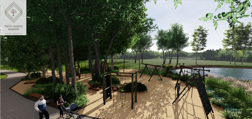 Miejsce zabaw zostanie oddzielone od ulicy, ścieżki rowerowej wzdłuż Wilgi i stawu, ogrodzeniem z krzewów, traw i rabat z kwiatami. Nie zabraknie też ławek dla opiekunów z widokiem zarówno na plac zabaw jak i staw.