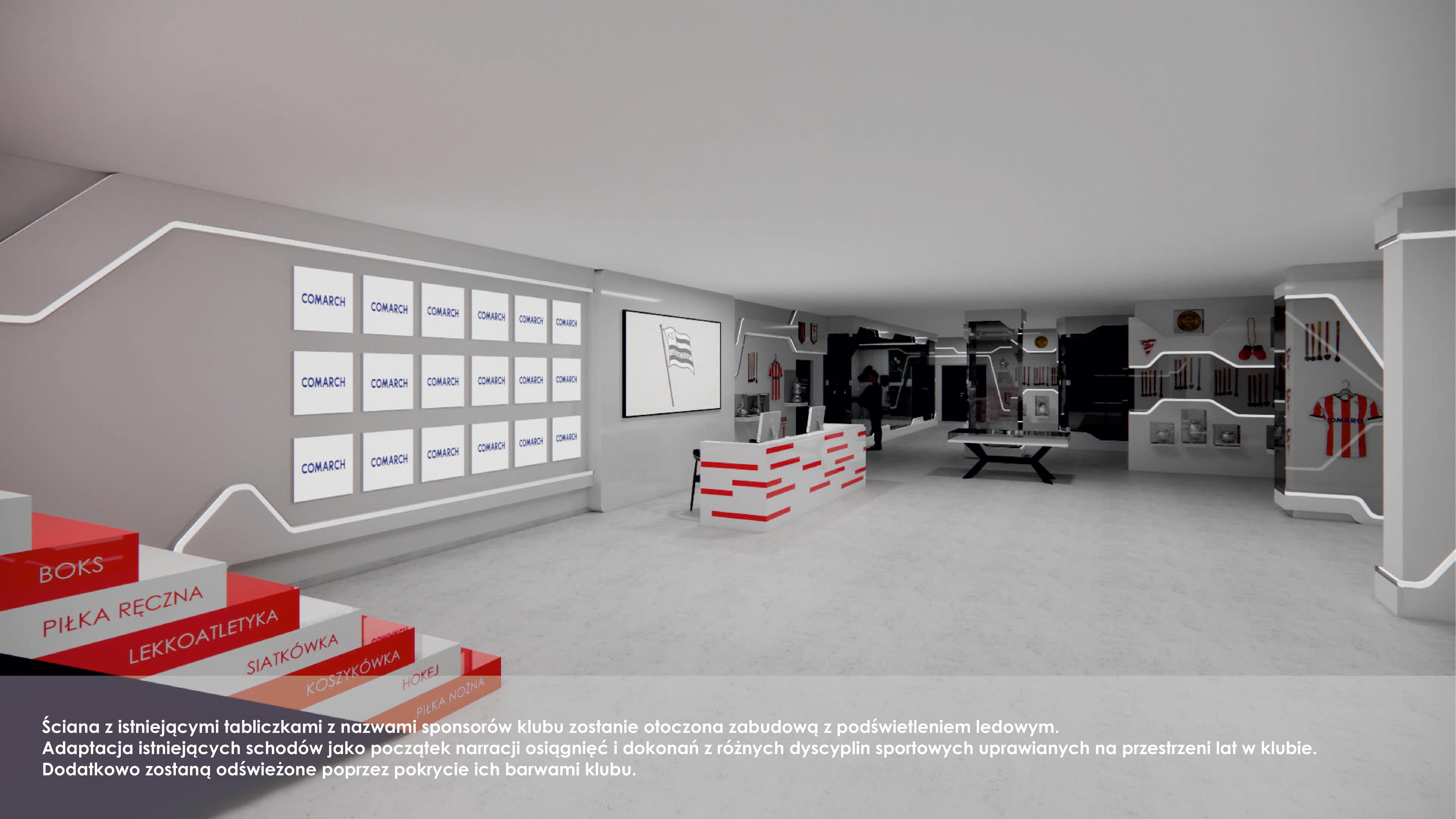 Dodatkowo, istniejąca sala konferencyjna, zwykle używana do wywiadów, konferencji prasowych i relacji z głównych imprez sportowych, zostanie przekształcona w miejsce warsztatowe. Będzie to miejsce, gdzie będziemy mogli pogłębiać naszą wiedzę, organizować prezentacje, wydarzenia i prowadzić warsztaty dla różnych grup społecznych. Sala ta będzie także dostępna dla organizowania eventów związanych z aktywnością fizyczną spoza głównego nurty działalności klubu. Dzięki elastycznej aranżacji i wyposażeniu, zarówno najmłodsi, jak i najstarsi goście Centrum będą mogli aktywnie uczestniczyć w działaniach.