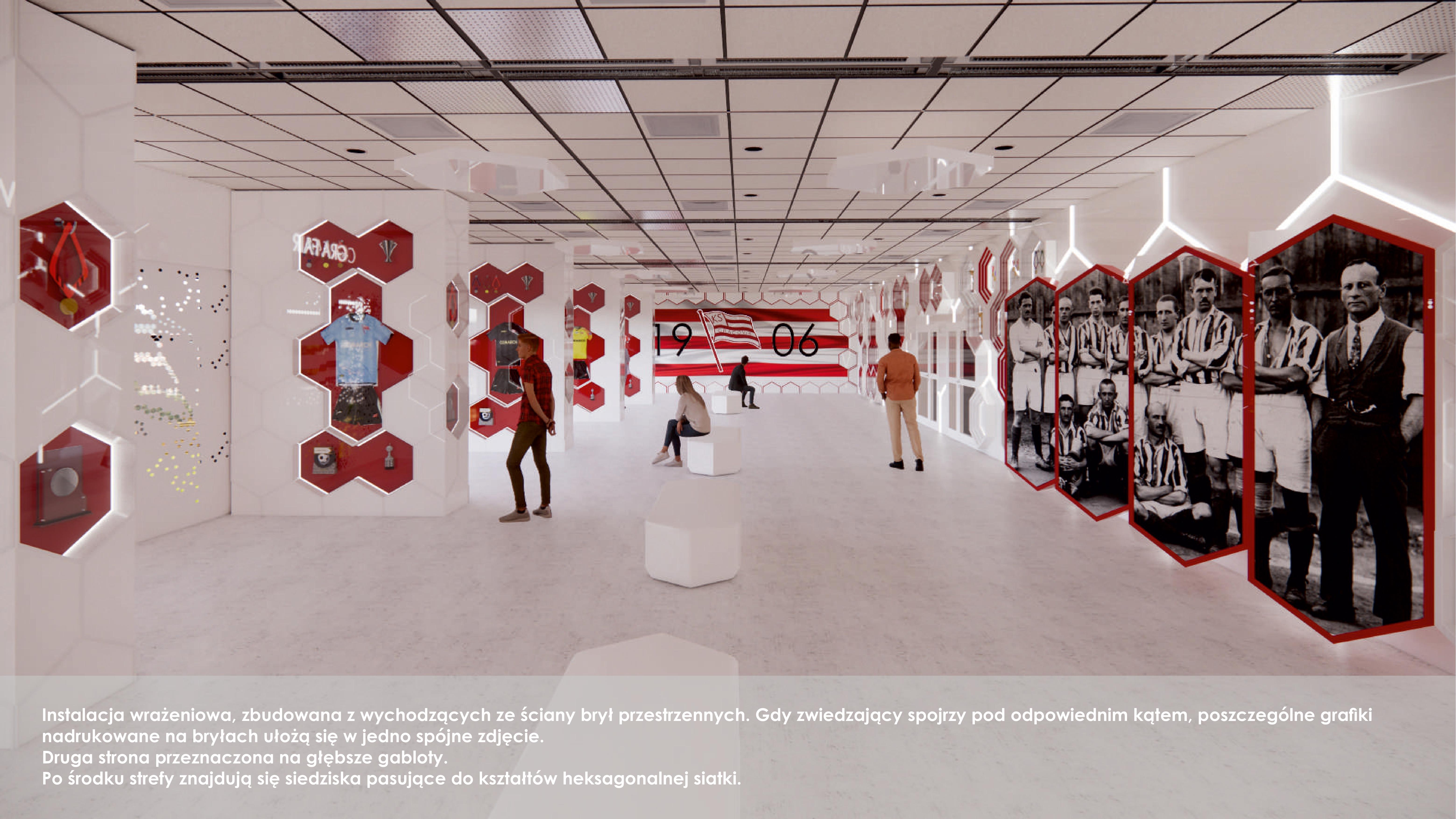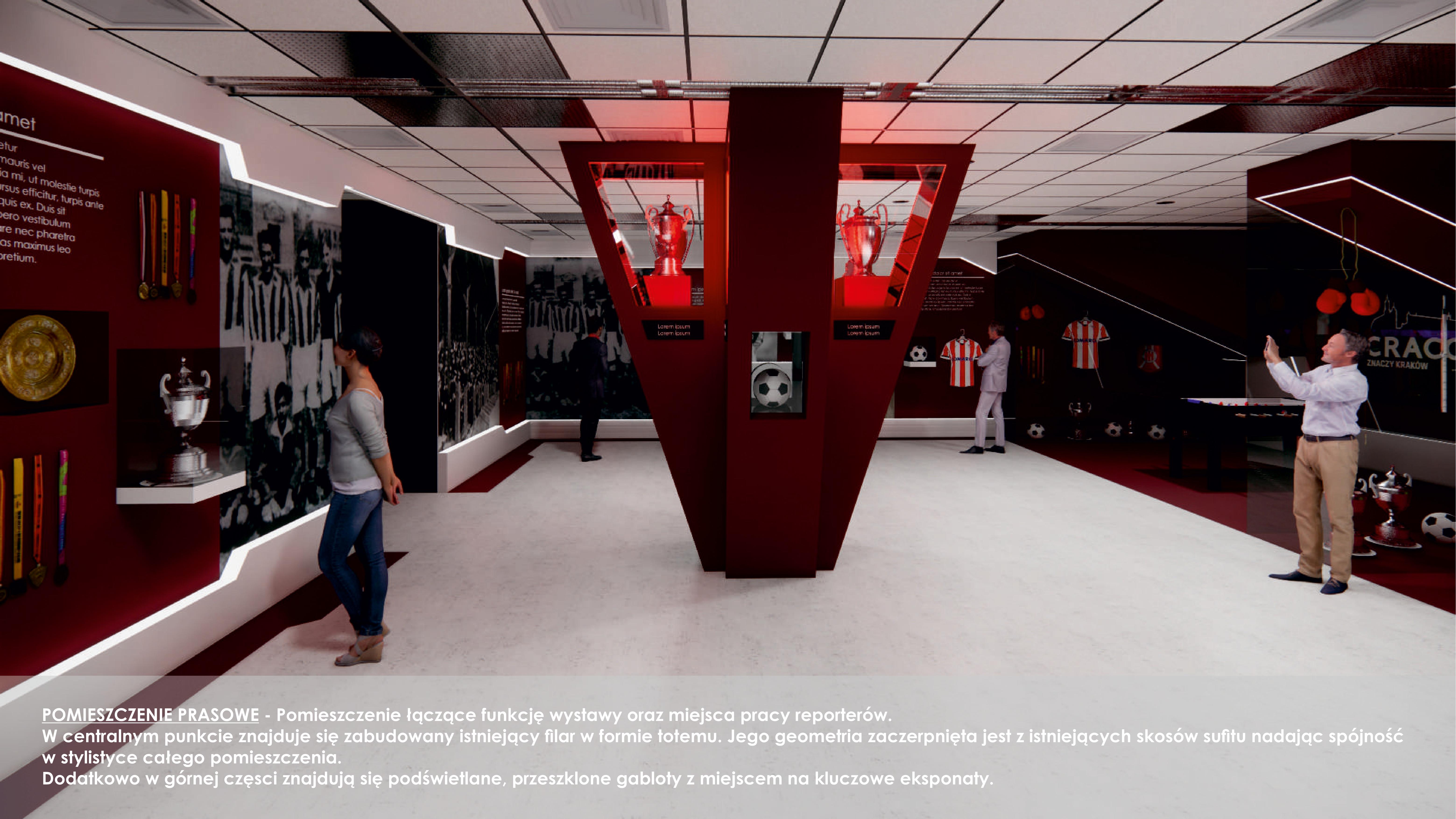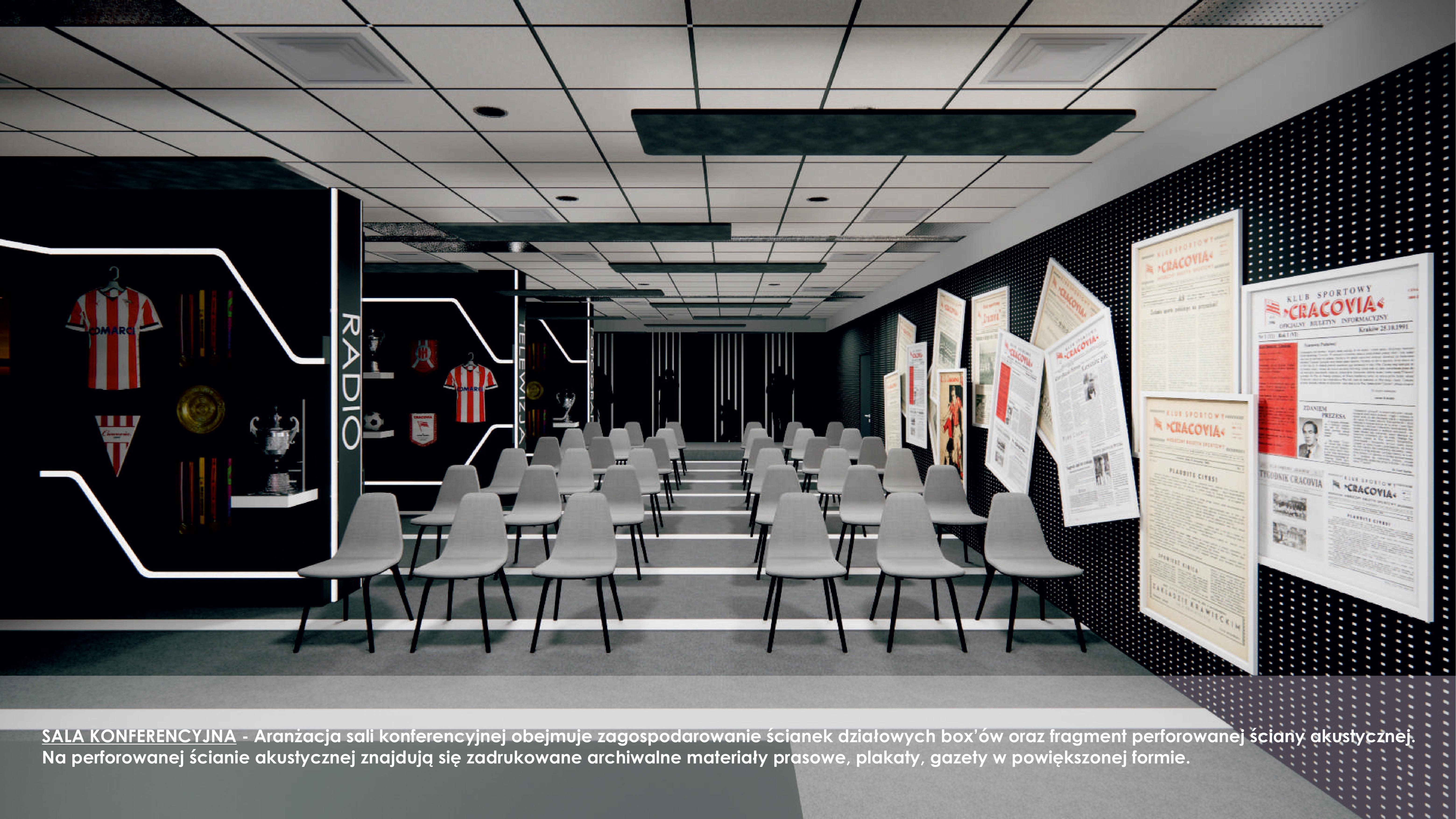 Integralną częścią Sali konferencyjnej będzie przylegająca sala gier i zabaw sportowych oraz współzawodnictwa. To tutaj będziemy mogli doświadczyć zdrowej rywalizacji, nauczyć się jej zasad praktycznie, po wcześniejszym zapoznaniu się z teorią i praktyką w innych częściach obiektu. Nowoczesne i interaktywne formy tej strefy, otoczone trofeami i przykładami sukcesów z historii klubu i krakowskiego sportu, będą idealnym otoczeniem do wykorzystania wiedzy zdobytej z poprzednich stref.