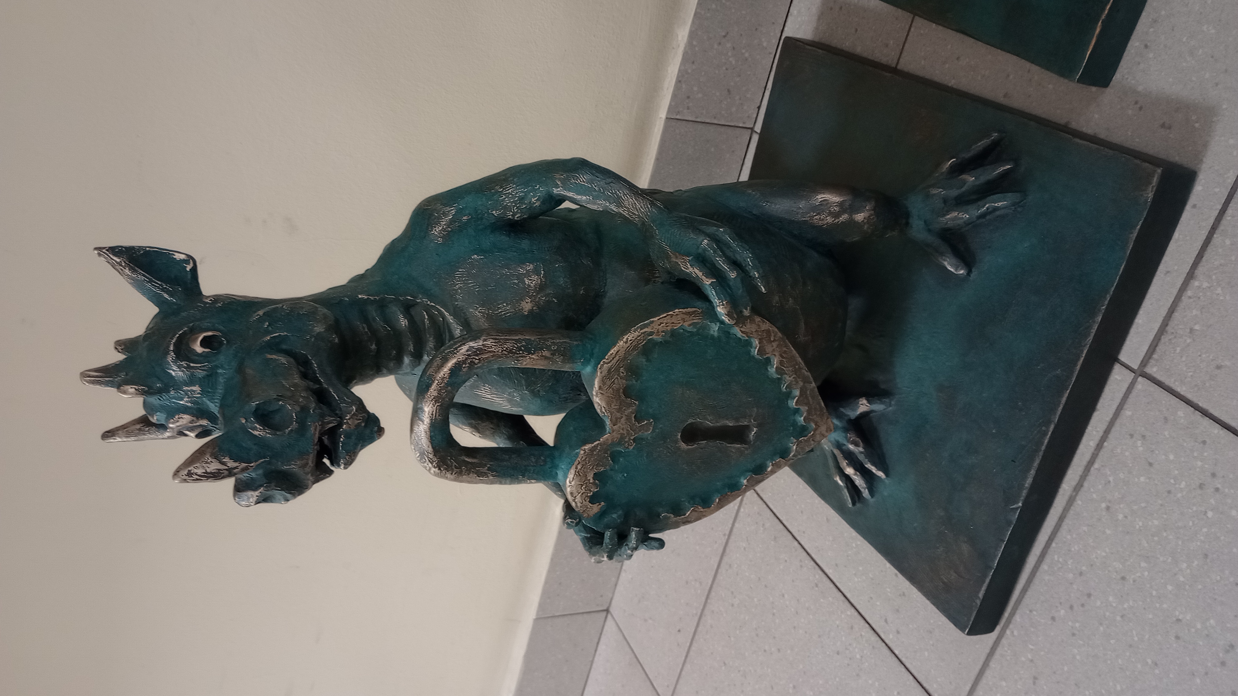 Smok ze stoliczkiem, na którym leżą różne przedmioty do sprzedaży: jabłko, zegarek, książka, rękawiczki... Smoka opowiada historię hali targowej na Grzegórzkach oraz targowiska "Pod Halą", jako ważnego miejsca dla lokalnej społeczności i jej tradycji.