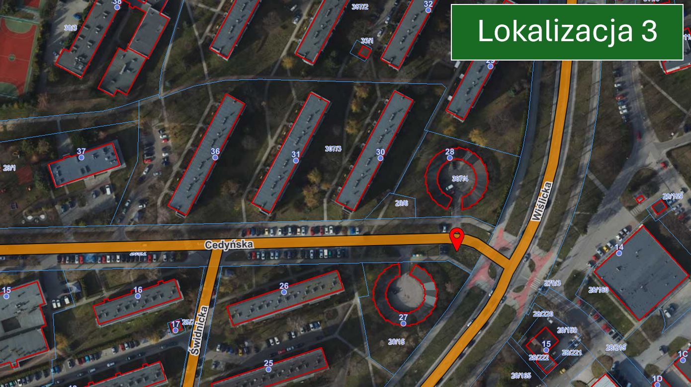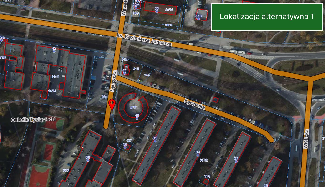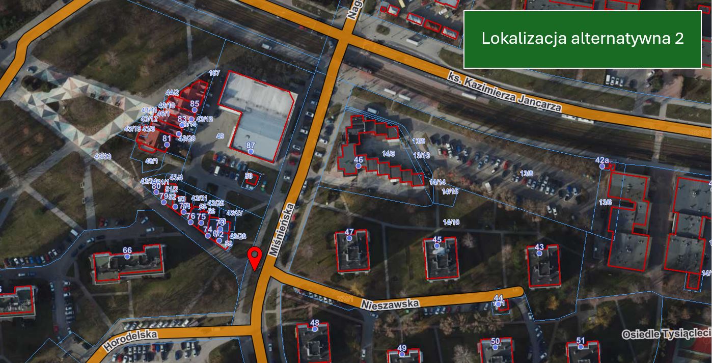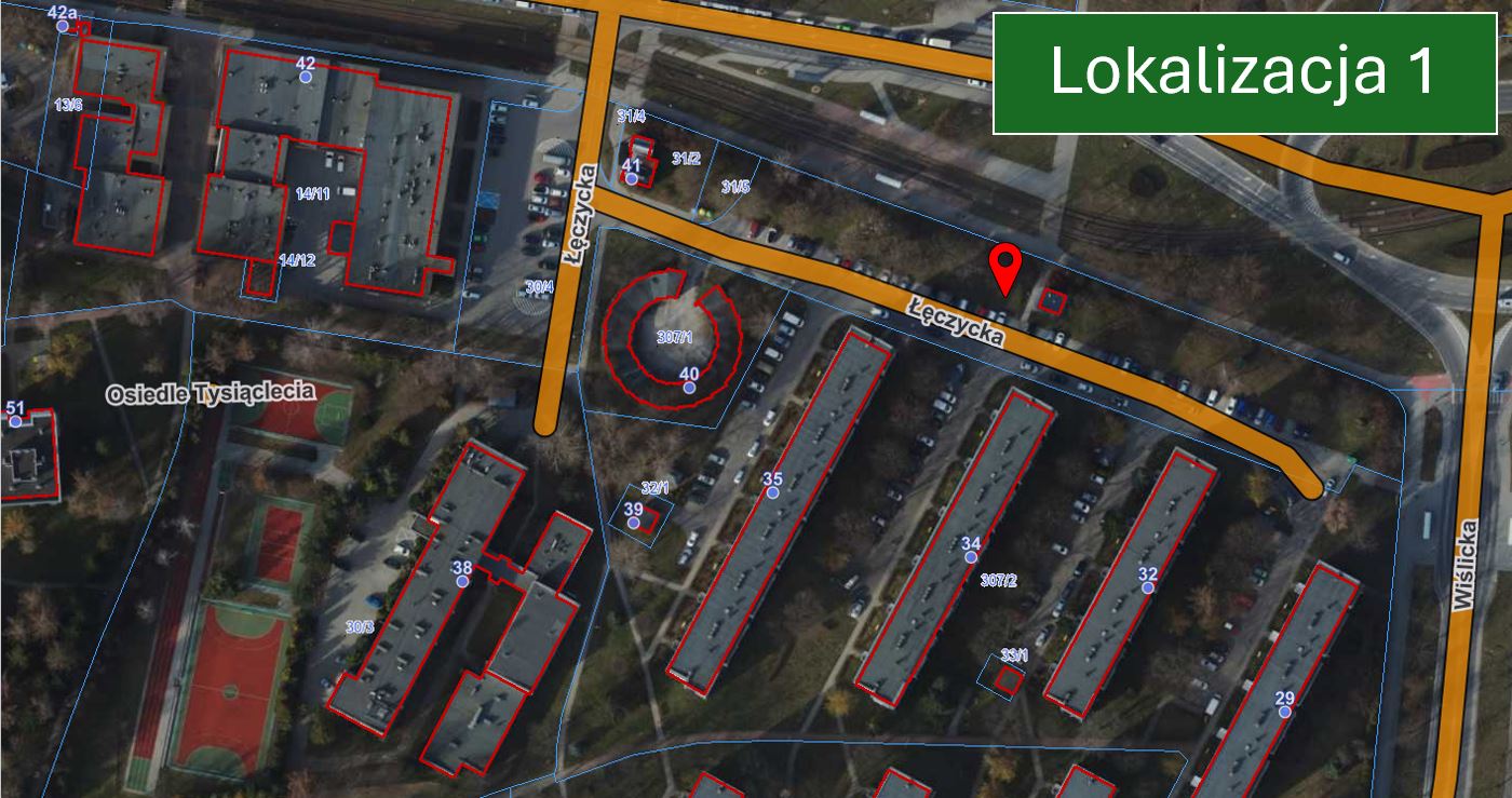 Lokalizacja wiat została wytypowana na podstawie dostępności działek gminnych w rejonie osiedla Tysiąclecia, na których można zlokalizować projekty budżetu obywatelskiego.
