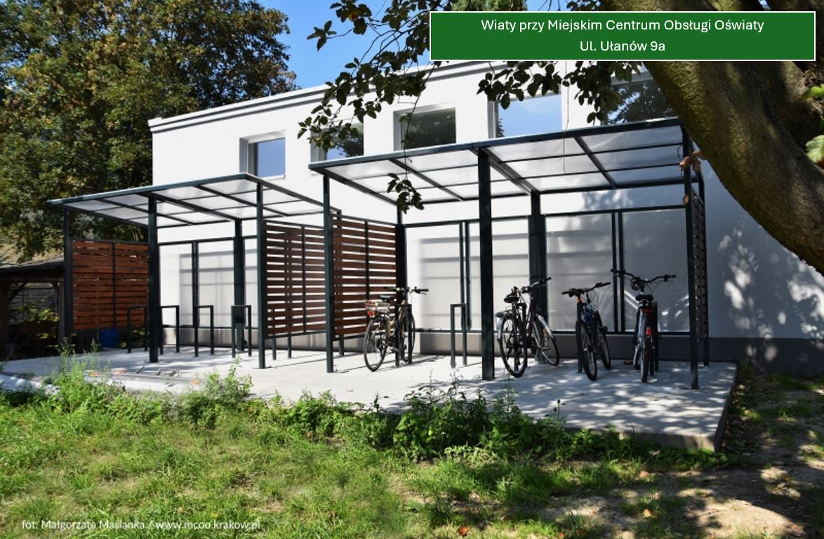 Proponuje się wiaty o stalowej konstrukcji, zabezpieczonej przed korozją, zadaszone i obudowane z trzech stron, co zapewni ochronę przed niekorzystnymi warunkami atmosferycznymi (deszcz, śnieg). Każda z wiat byłaby wyposażona w stojaki rowerowe typu „U” zgodne z Standardami technicznymi i wykonawczymi dla infrastruktury rowerowej Miasta Krakowa. Jedna wiata powinna pomieścić min. 5 stojaków rowerowych, co przekłada się na 10 miejsc postojowych dla rowerów pod jedną wiatą. Teren bezpośrednio pod wiatą byłby utwardzony.