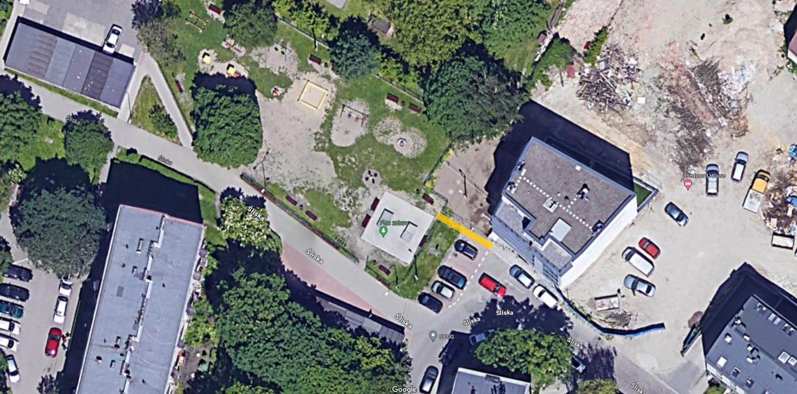 Projekt zakłada przedłużenie chodnika wzdłuż ulicy Śliskiej tak by stworzyć bezpieczne wejście na plac zabaw od strony płd -wsch, oraz utworzyć chodnik przed parkingiem samochodowym tak, aby dzieci idące na plac zabaw nie wchodziły na jezdnię.