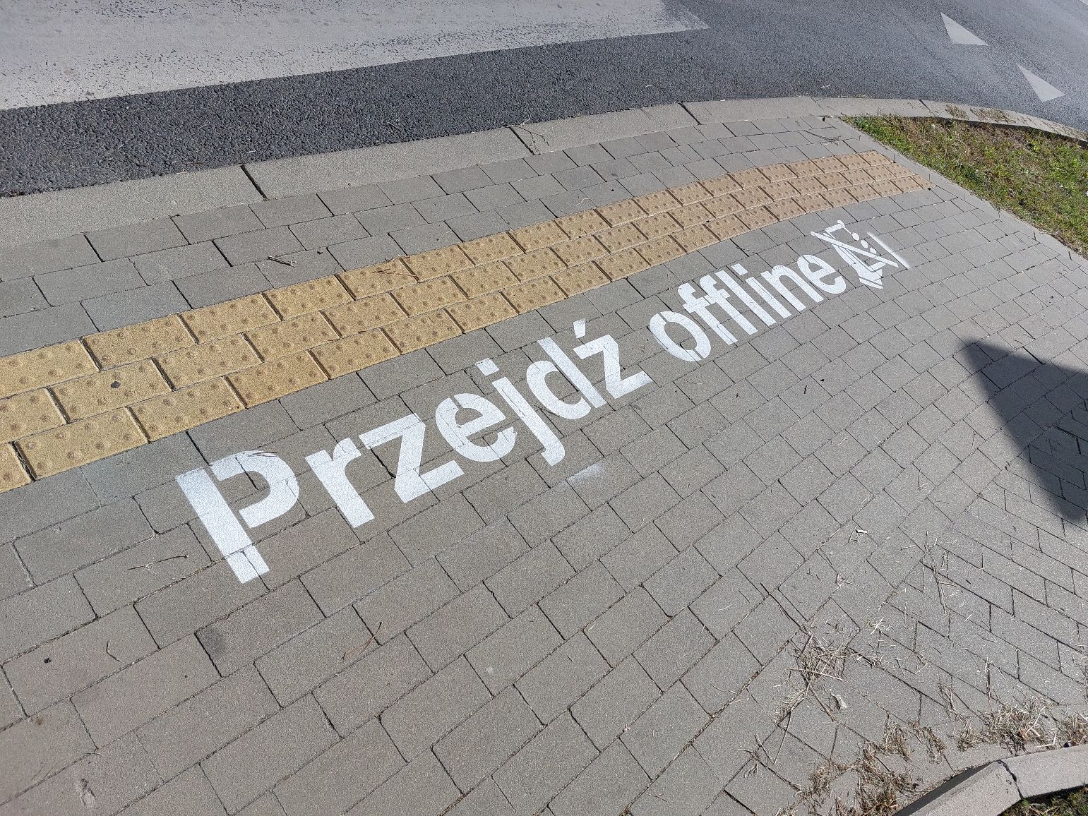 Projekt graficzny dot. bezpieczeństwa polega na namalowaniu napisów typu: „Przejdź offline” na wybranych przejściach dla pieszych. Znaki te powinny być przed przejściem.