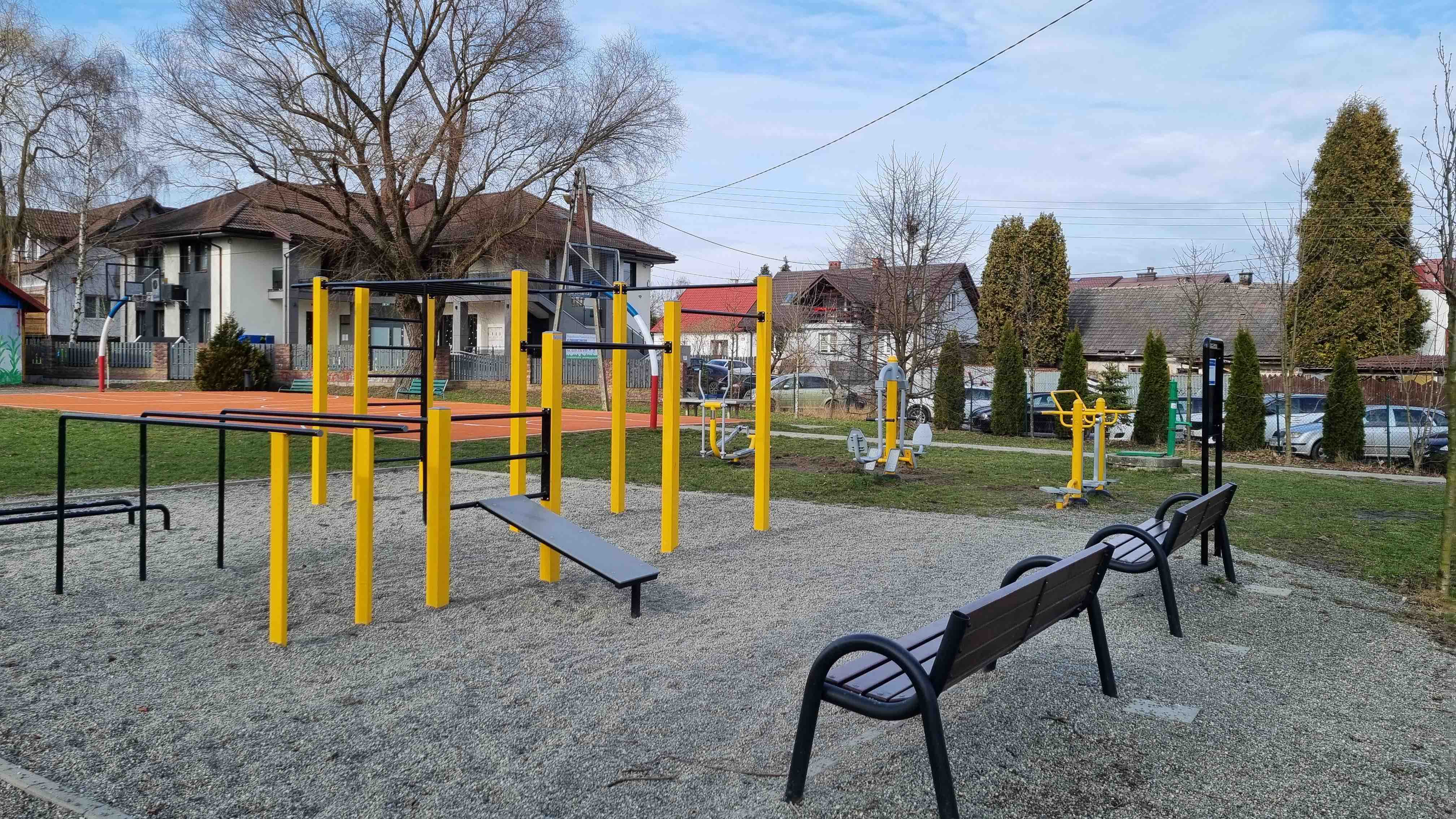 - strefa sportu od strony szkoły specjalnej odpowiadająca na potrzeby młodzieży, dzieci ze szkoły specjalnej, ale i seniorów - tutaj proponujemy mini siłownie zewnętrzną, zestaw do cross-fitu, stół do ping-ponga, a może i jakieś boisko do street koszykówki (podobne rozwiązania jak na zdjęciu).