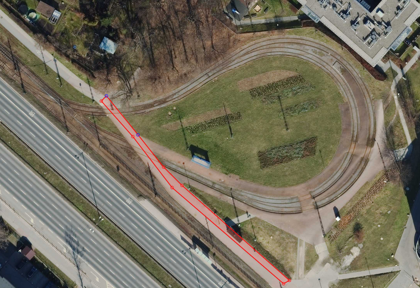 Na zaznaczonym na czerwono obszarze o powierzchni mniej więcej 200 metrów kwadratowych planuje się wybudowanie ścieżki rowerowej lub wyznaczenie strefy przeznaczonej na przejazd rowerowy, która pozwoli na bezkolizyjny ruch rowerowy.