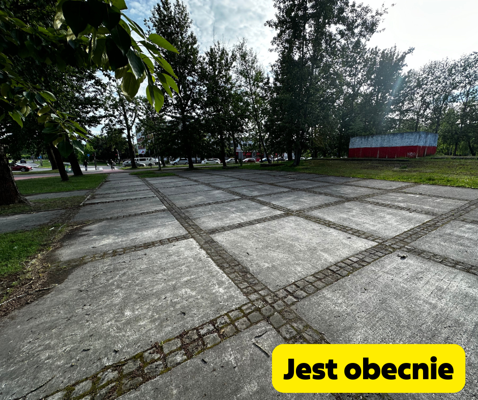 zachodniej stronie cokołu. Po usunięciu betonowych elementów ziemia zostanie wyrównana uporządkowana i przygotowana do wysiania trawy oraz łąki kwietnej. Ostatnim etapem będzie wysianie trawy i łąki kwietnej lub nasadzeń zieleni.