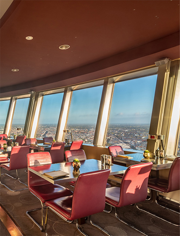 Znajdująca się w kopule tarasu widokowego, na wysokości 85 metrów/278 stóp, goście mogą delektować się wykwintnym jedzeniem i napojami w restauracji i dwóch barach. Restauracja otrzymała wiele nagród, w tym Trend Top Restaurant of the Year 2018 & 2019, Gourmet Award Premium Restaurant of the Year 2019 & 2020 oraz uznanie szefa kuchni Jozefa Masaroviča – Gourmet Award Chef of the Year 2020. Wieża UFO jest również obiektem eventowym i może być wynajmowana na prywatne imprezy dla maksymalnie 200 gości. A żeby było jeszcze ciekawiej, raz w roku na wieży UFO odbywają się światowej sławy zawody w bieganiu po wieżach!