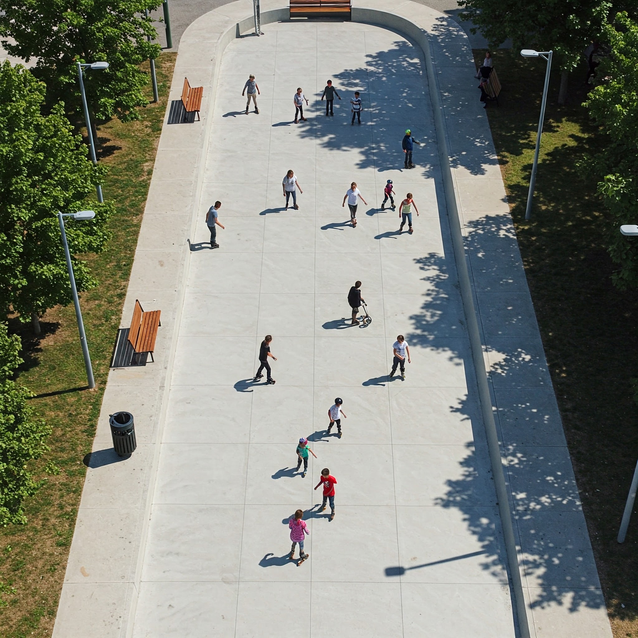 Nawierzchnia: wysokiej jakości, gładka nawierzchnia, idealna do jazdy na rolkach, wrotkach, hulajnogach oraz łyżwach.