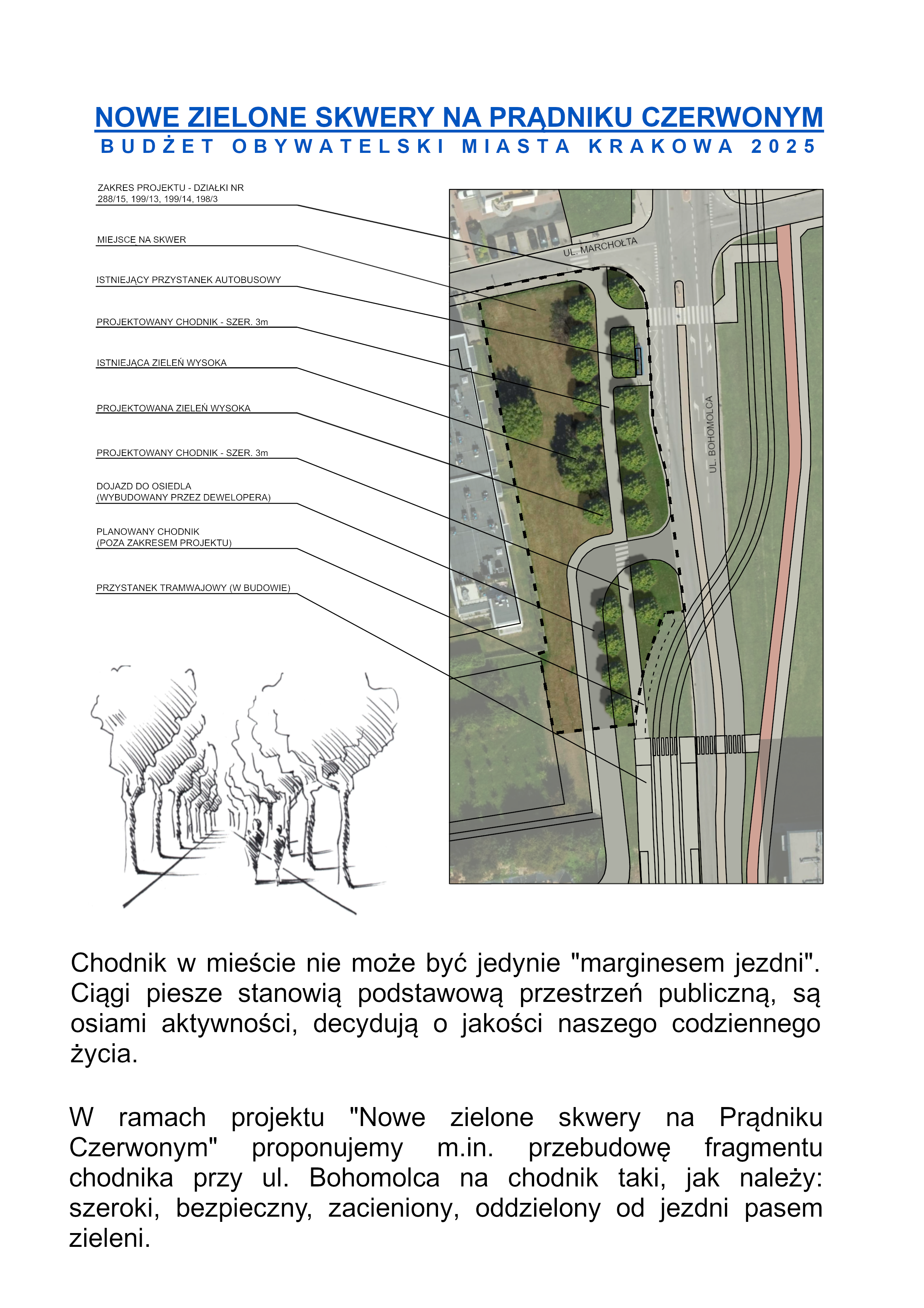 Zadanie polega na utworzeniu na terenie Prądnika Czerwonego dwóch zielonych skwerów i jednego parku kieszonkowego. Miejsca te znajdują się w bardzo ruchliwej części Prądnika czyli przy Rondzie Barei i przy ulicach Dobrego Pasterza, Bohomolca.