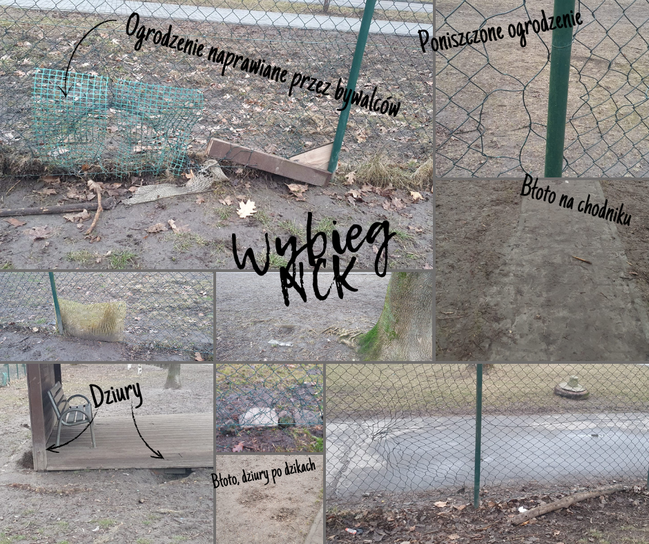 - Uszkodzone ogrodzenia i furtki – wybiegu przy NCK występują liczne dziury w ogrodzeniu, a furtka przejściowa nie zamyka się prawidłowo, co stwarza ryzyko ucieczki zwierząt. Ponadto ogrodzenie jest "elastyczne", co sprawia, że jest wyjątkowo podatne na urazy, naruszenia. Ogrodzenie regularnie forsują dziki. Do tej pory ogrodzenie naprawiali użytkownicy - zastawiając kamieniami, deskami, łatanie kawałkami siatki i drutu