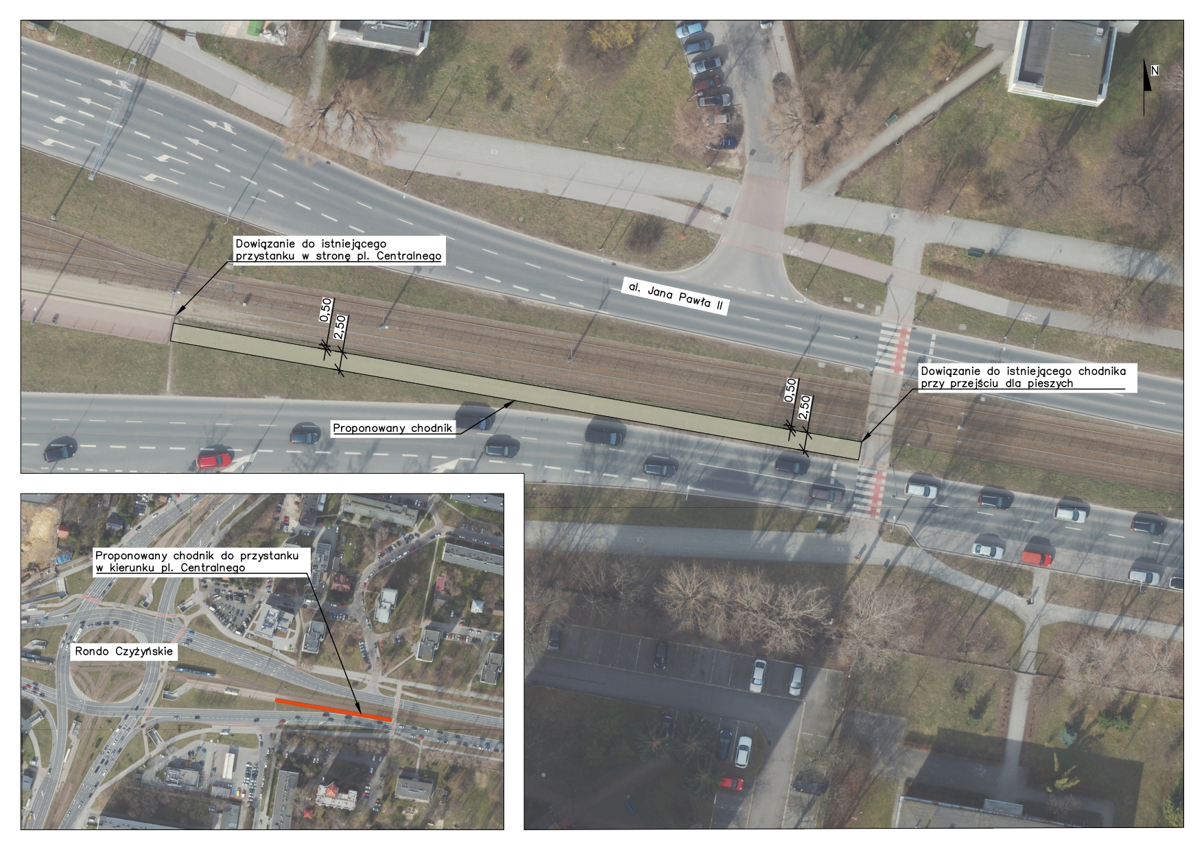 Wnioskodawca w ramach projektu budżetu obywatelskiego wskazał budowę chodnika pomiędzy przystankiem Rondo Czyżyńskie 01 (peron w stronę pl. Centralnego) a naziemnym przejściem dla pieszych przez Al. Jana Pawła II.