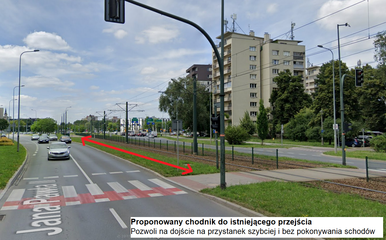 i Infrastruktury UMK propozycja budowy chodnika jest bezzasadna., gdyż budowa chodnika o min. szerokości 2m zgodnego z obowiązującymi Standardami Infrastruktury Pieszej Miasta Krakowa (Zarządzenie nr 3188/2021 PMK z dnia 9.11.2021r.) wiąże się z przebudową części alei Jana Pawła II. Ponadto wskazuje się, że przy każdym peronie tramwajowym zlokalizowane są windy dla osób o ograniczonej mobilności ułatwiające pokonywanie różnic poziomów.