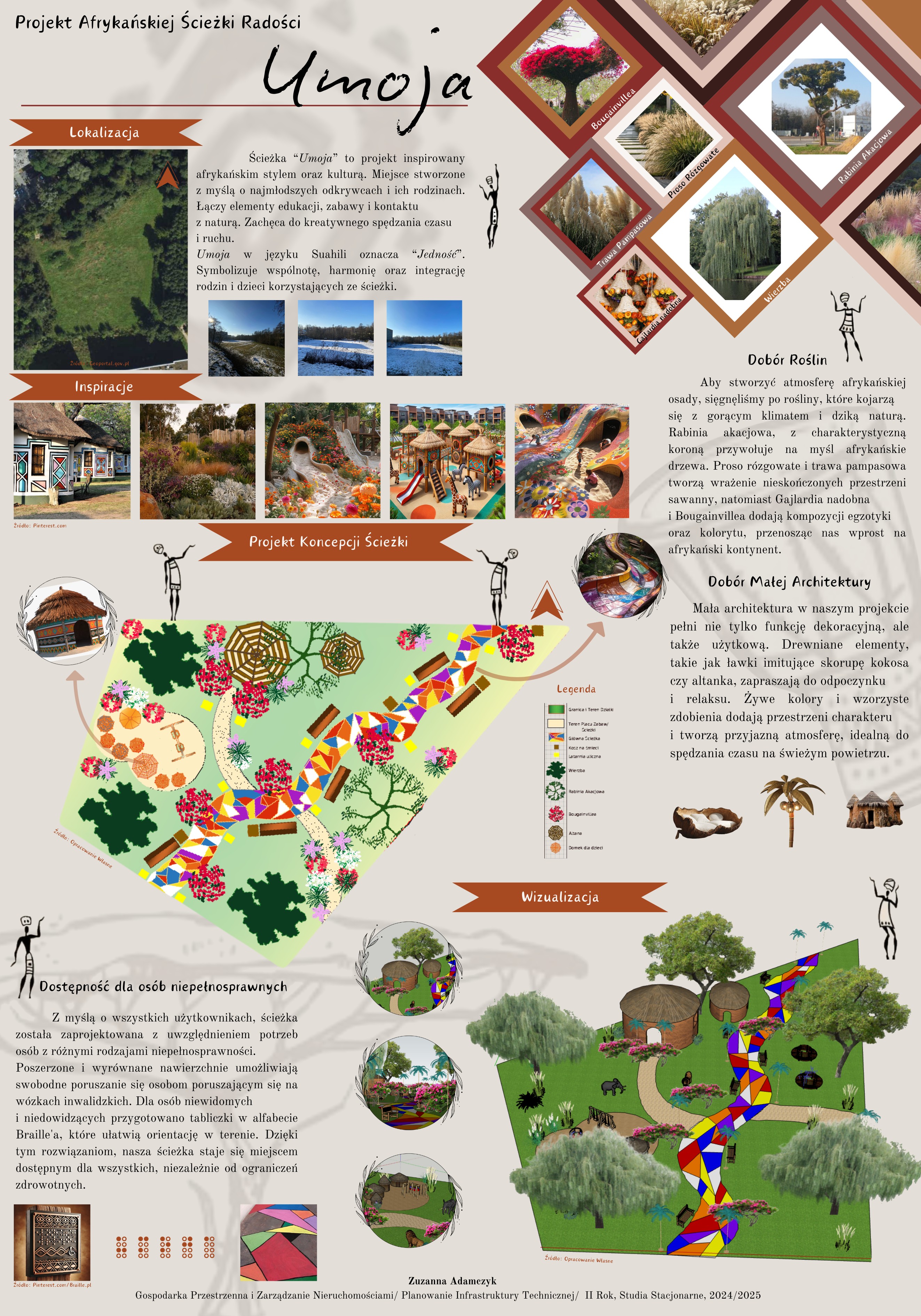 Projekt stworzenia ścieżki "UMOJA" to projekt inspirowany afrykańskim stylem oraz kulturą. Miejsce stworzone z myślą nawet o najmłodszych odkrywcach, rodzinach, a także społeczności afrykańskiej, która na przestrzeni lat zdecydowanie wzrosła.