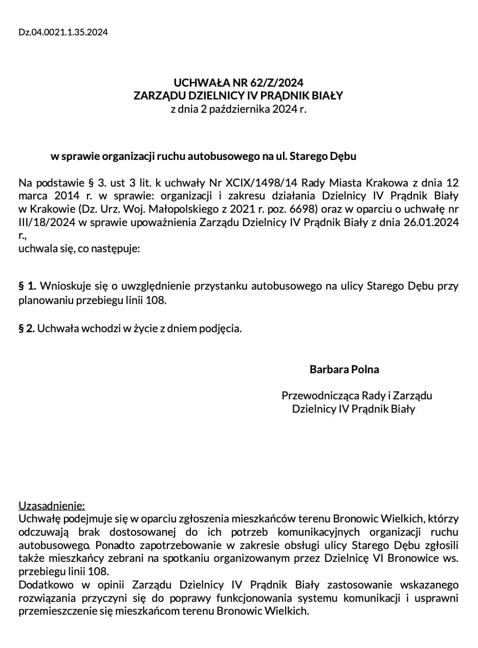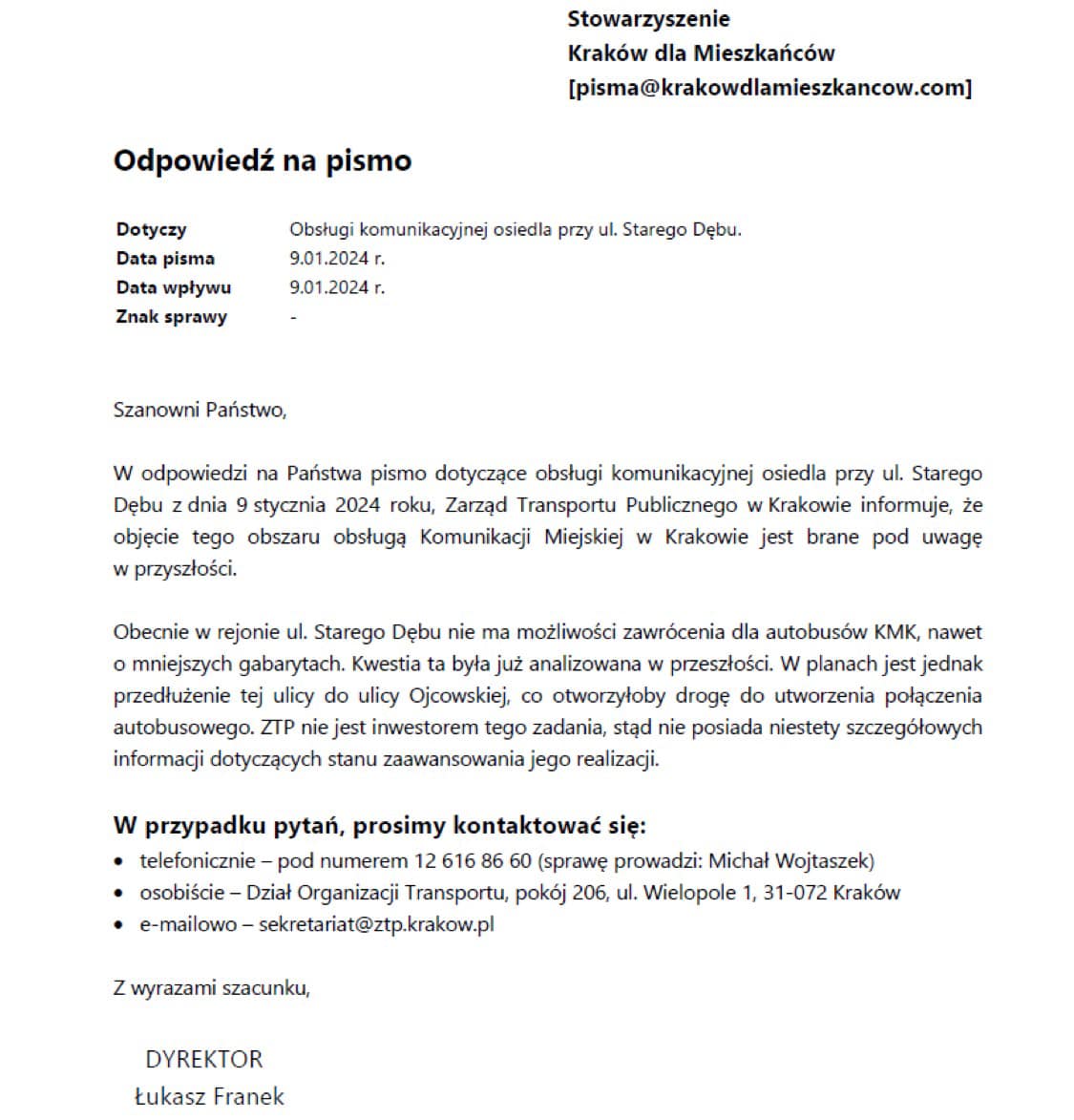 Mieszkańcy tego obszaru od kilku lat zabiegają o utworzenie lub wydłużenie linii autobusowej obsługującej ich osiedle. Z posiadanych informacji wynika, że MPK planuje doprowadzenie linii 108 do osiedla, jednak barierą uniemożliwiającą jej realizację jest brak miejsca do bezpiecznego zawracania autobusu. Obecnie brak takiego miejsca całkowicie blokuje możliwość uruchomienia komunikacji miejskiej w tym rejonie. Końcowy odcinek drogi jest nieutwardzony, a zwarta zabudowa uniemożliwia manewrowanie autobusu na wewnętrznych drogach osiedla.