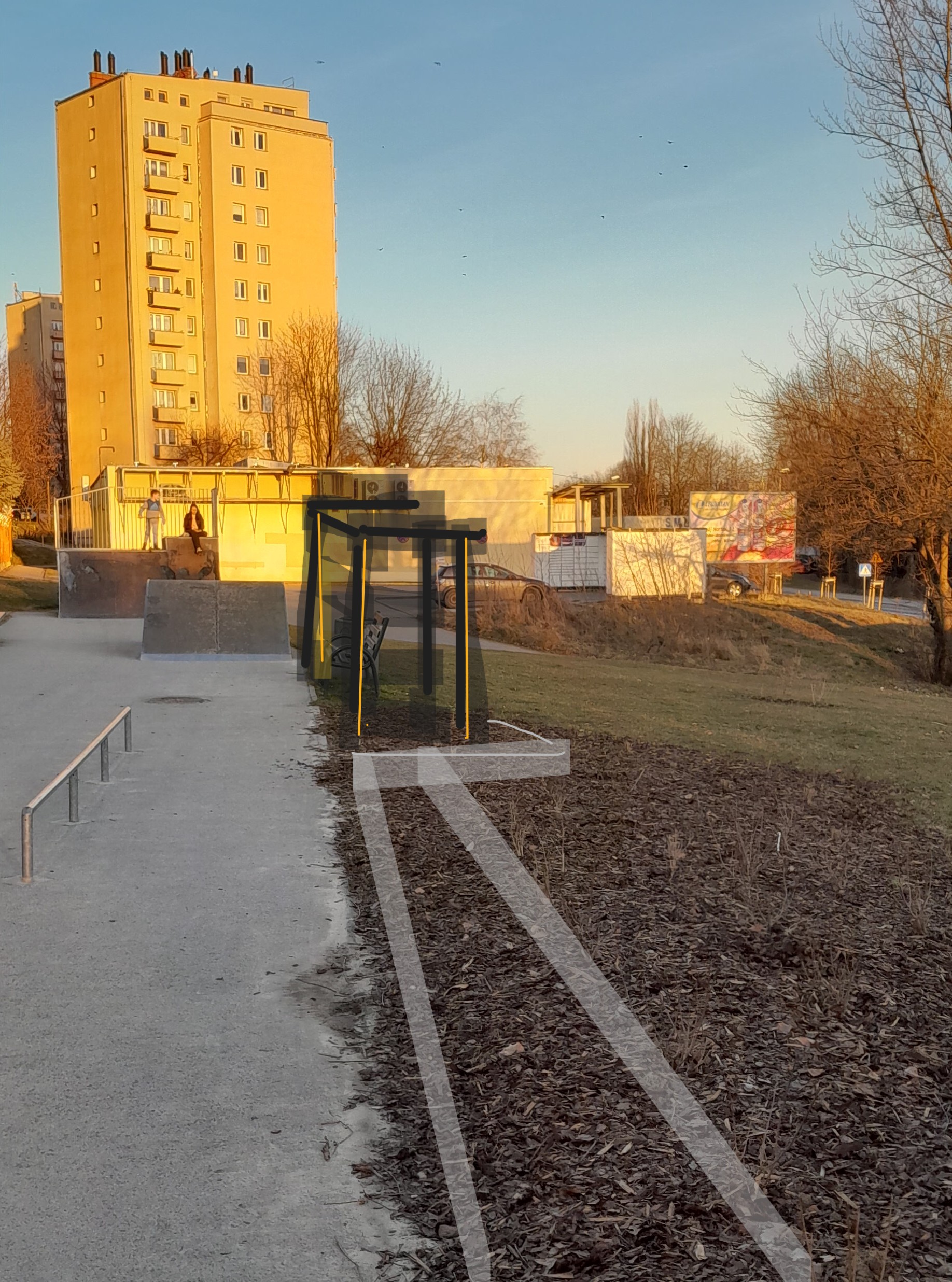 aby nie wejść w kolizję z przebiegiem sieci infrastruktury podziemnej proponuje się lokalizację altanki w miejscu oznaczonym na rycinie, przebieg ścieżki oznaczony został schematycznie. Pożądane jest aby nie zmniejszyła się ilość i lokalizacja istniejących ławek przy torze skateparku, wskazane dodanie jeszcze jednej ławki do umieszczenia w altance.
