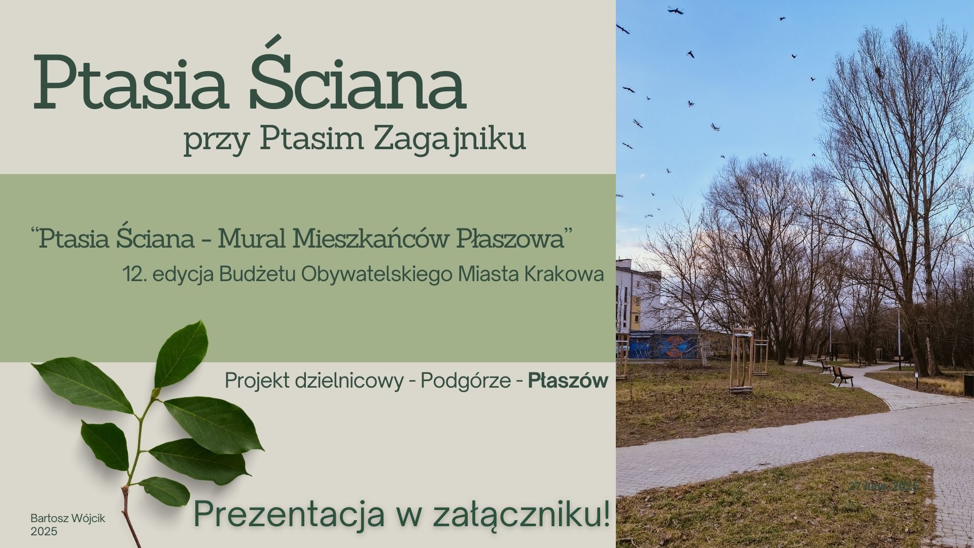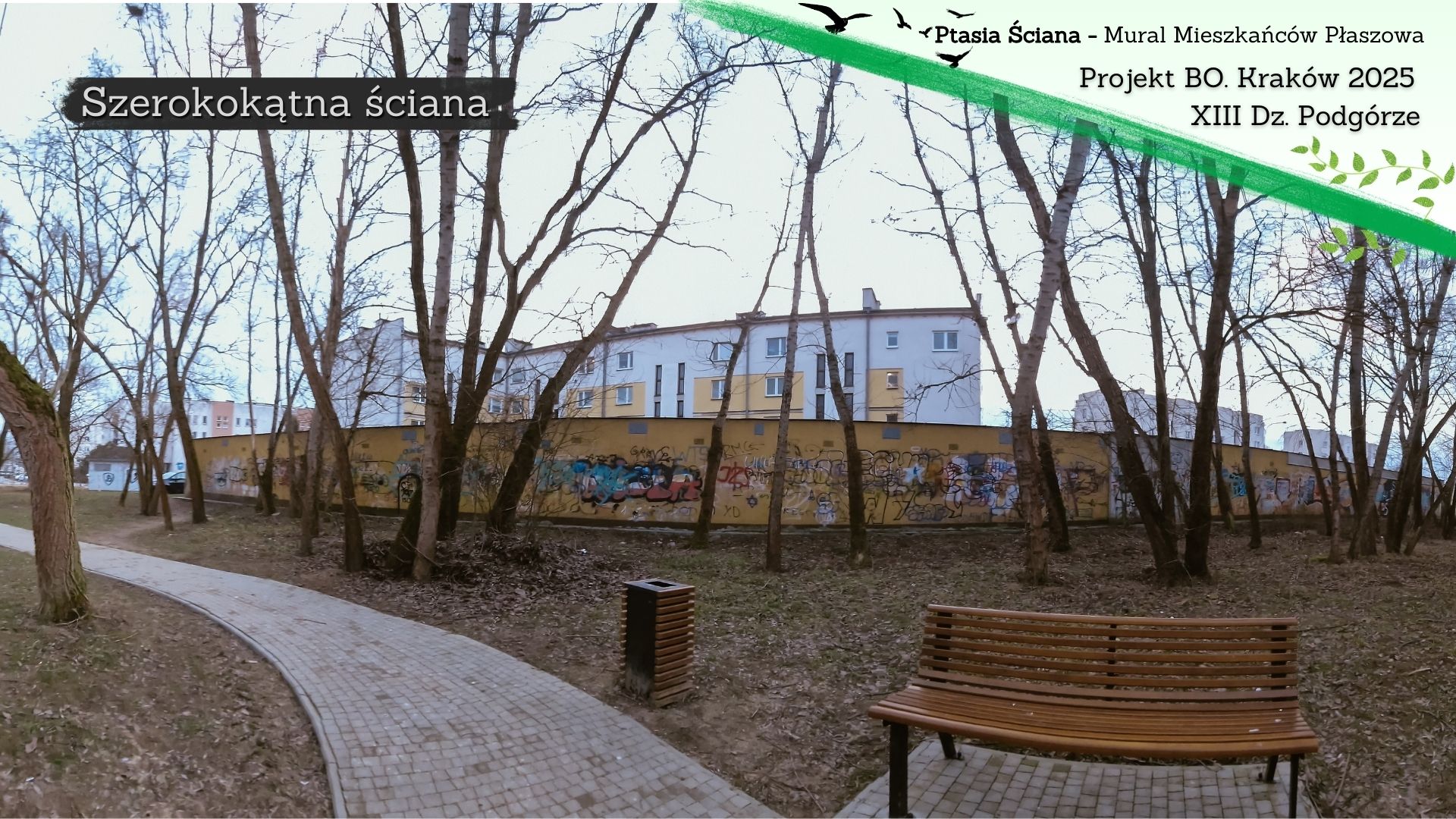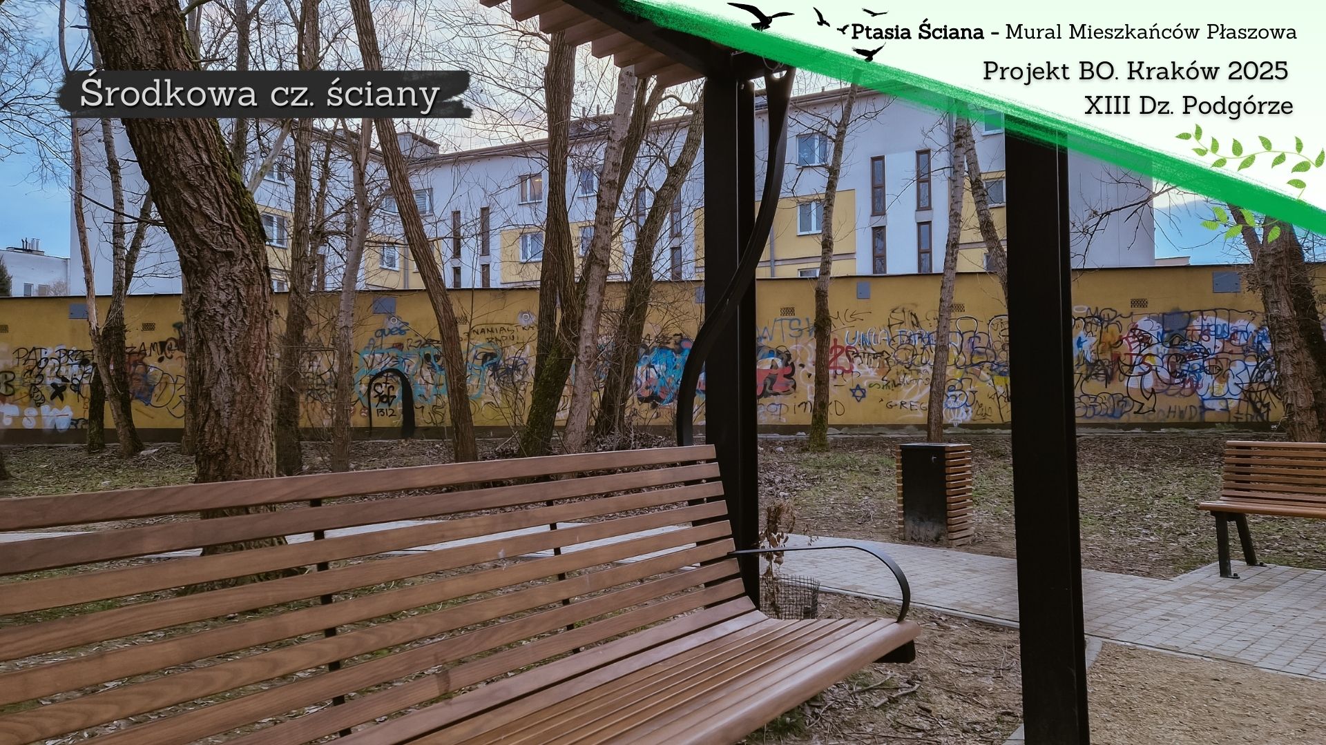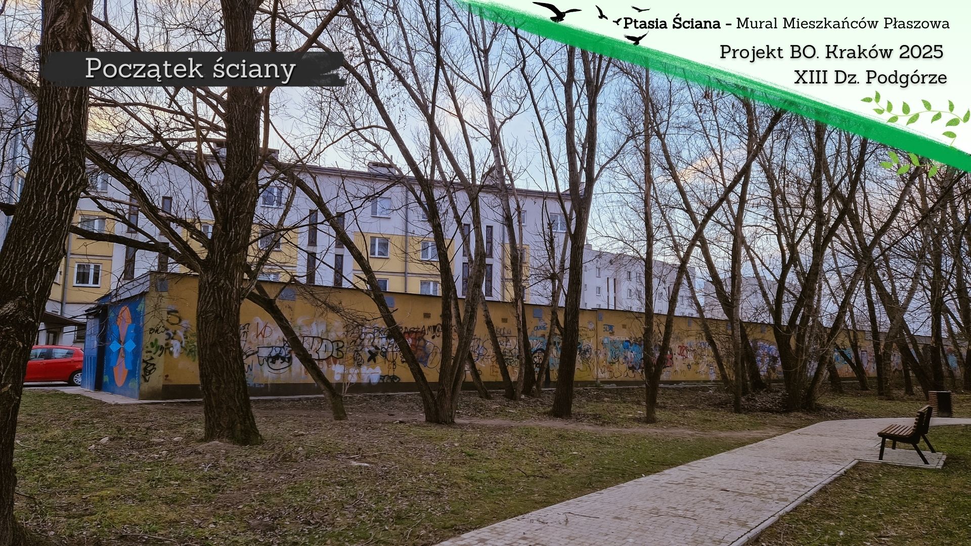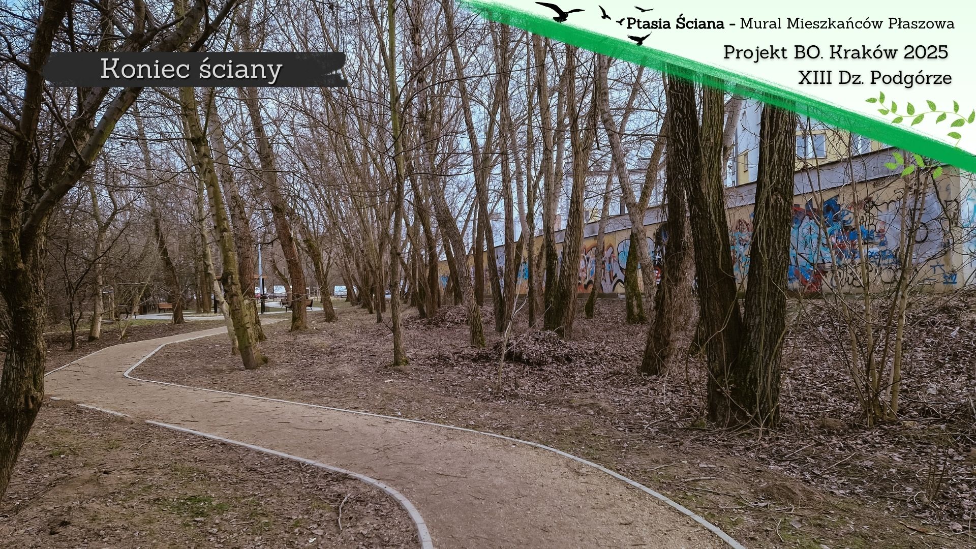Biuro Architekta Miasta negatywnie opiniuje projekt pn. „Ptasia Ściana - Mural Mieszkańców Płaszowa” z nr BO.D13.48/25 zgłoszonego do Budżetu obywatelskiego Miasta Krakowa 2025 z uwagi na niezgodność z par 17, pkt 1, ust. 7. wskazana lokalizacja nie stanowi własności Gminy Miejskiej Kraków. Zgodnie z UCHWAŁĄ NR LI/1410/21 RADY MIASTA KRAKOWA z dnia 13 stycznia 2021 r. w sprawie Regulaminu budżetu obywatelskiego Miasta Krakowa i § 17. 1. w ramach procedury budżetu obywatelskiego nie mogą być realizowane projekty: 7) które są planowane do realizacji na gruntach nie należących i nie pozostających we władaniu Miasta, a przedmiotowa działka jest w użytkowaniu wieczystym osób fizycznych.
