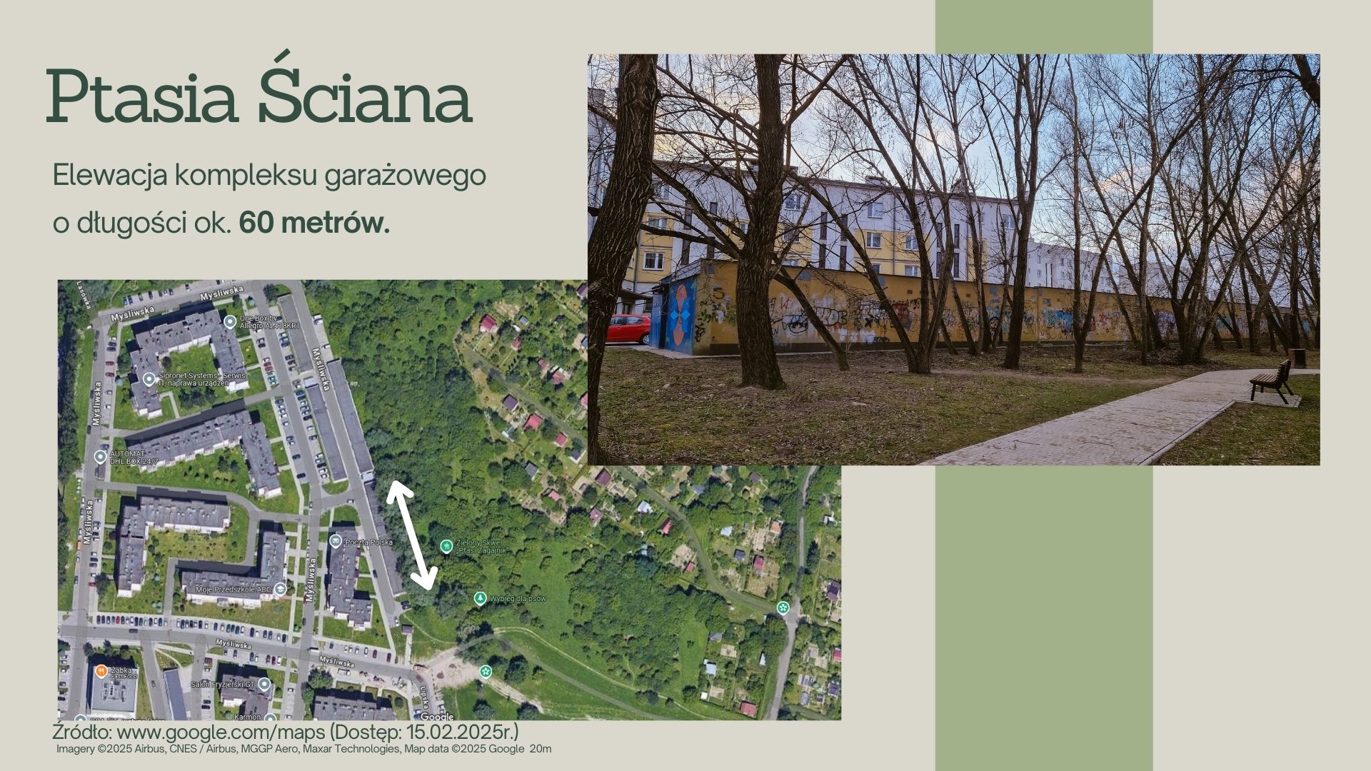 Główna lokalizacja: Zewnętrzna ściana garaży (ok. 60m), wzdłuż "Ptasiego Zagajnika" przy ul. Myśliwskiej, działka nr 151/9 Obr. 18 Podgórze