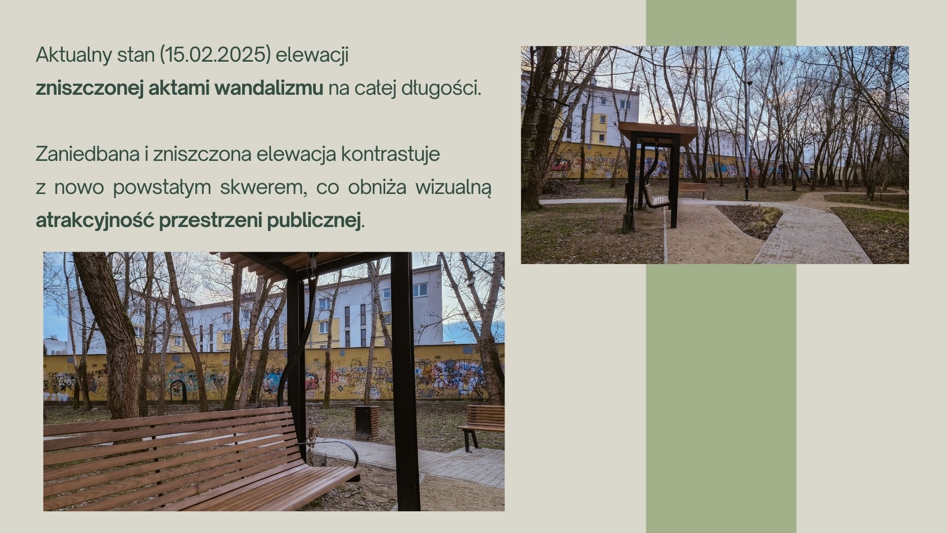 - Zagospodarowanie (około 60m) elewacji, która obecnie jest zanieczyszczona aktami wandalizmu.