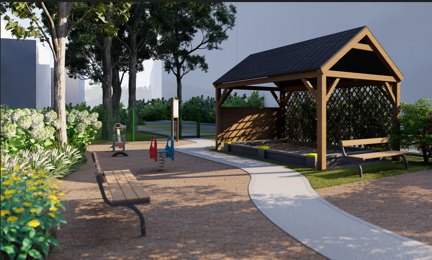 Aby zabezpieczyć bawiące się dzieci i opiekunów od spalin i kurzu z ruchliwej ulicy w projekcie przewidziano również wymianę ogrodzenia wzdłuż ulicy Kmiecej, usunięcie wybrakowanego żywopłotu i nasadzenia z wytrzymałych i pochłaniających pył kolorowych odmian roślin, które znacznie ożywią przestrzeń oraz będą stanowić świetną barierę chroniącą przed negatywnym wpływem ulicy.